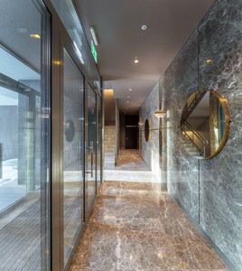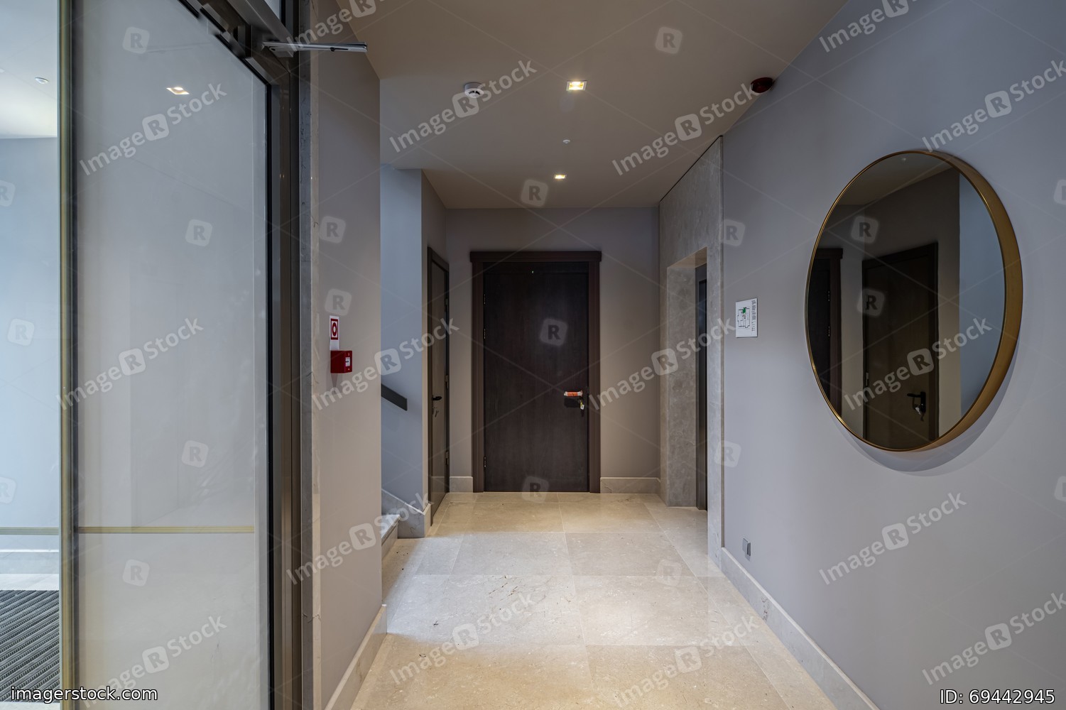Modern interior of entrance. Mirror on grey wall. Residential building