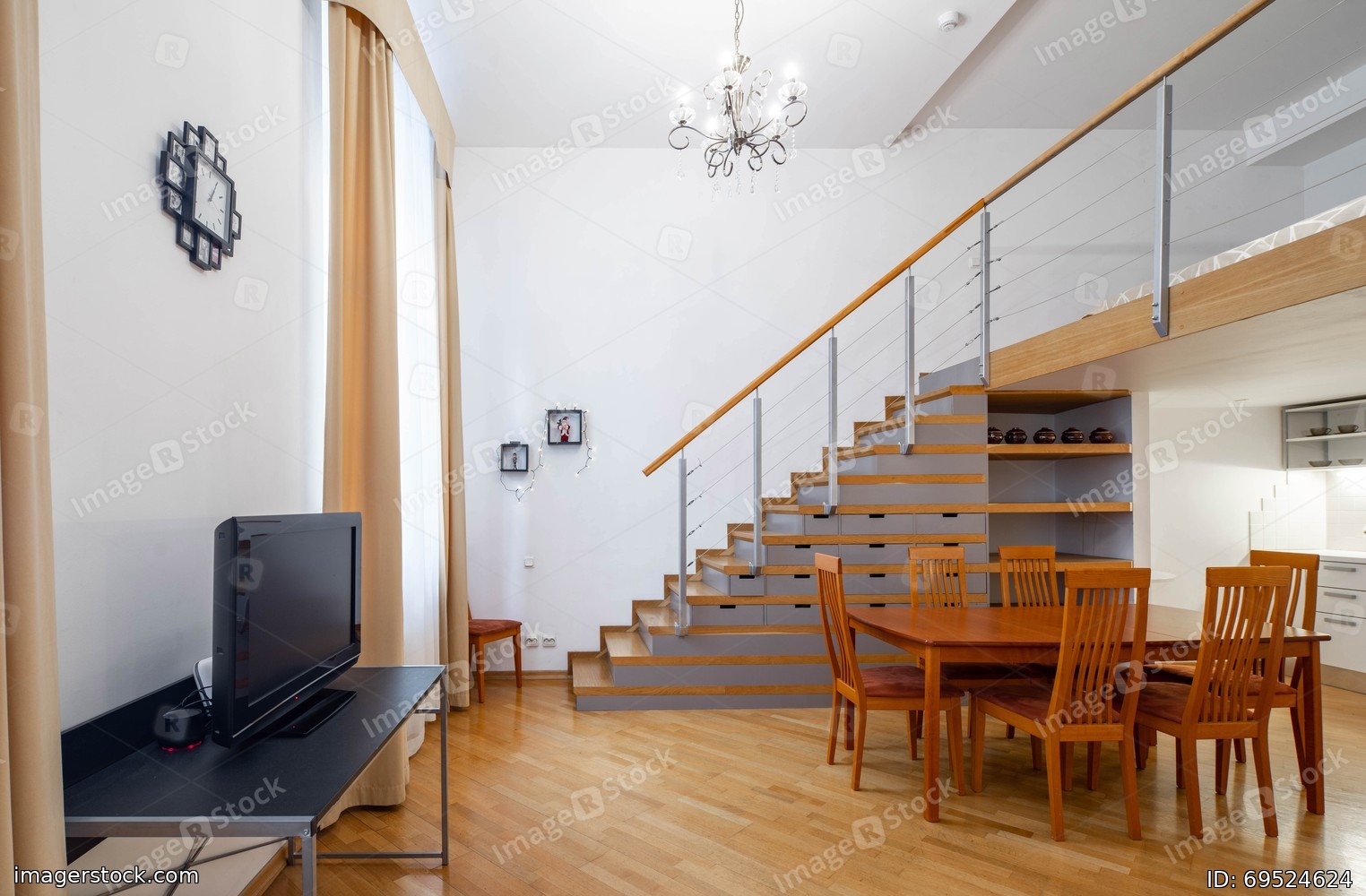 Interior in warm tones. Private house. Staircase to the second floor. Table and chairs.