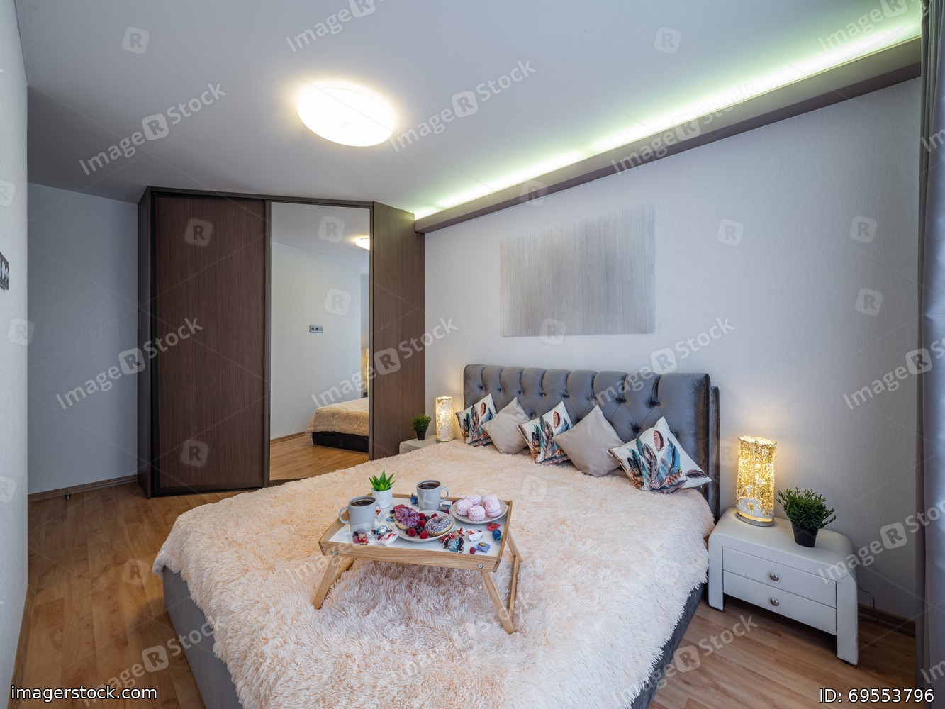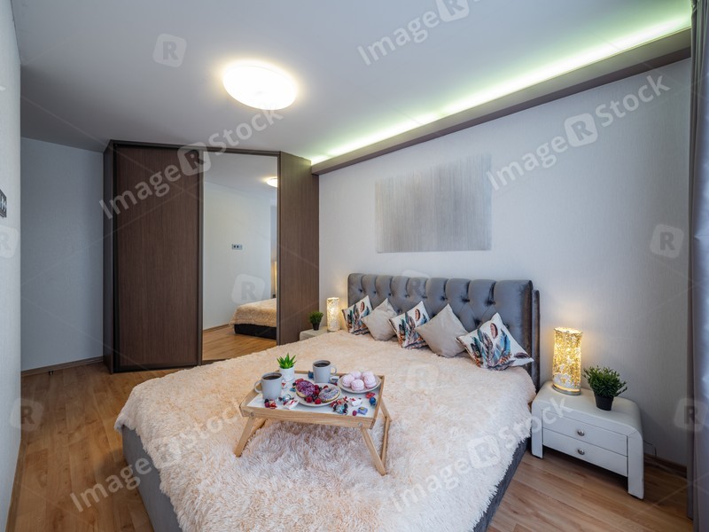 Interior of bedroom in modern apartment. Wooden wardrobe. Breakfast on bed.
