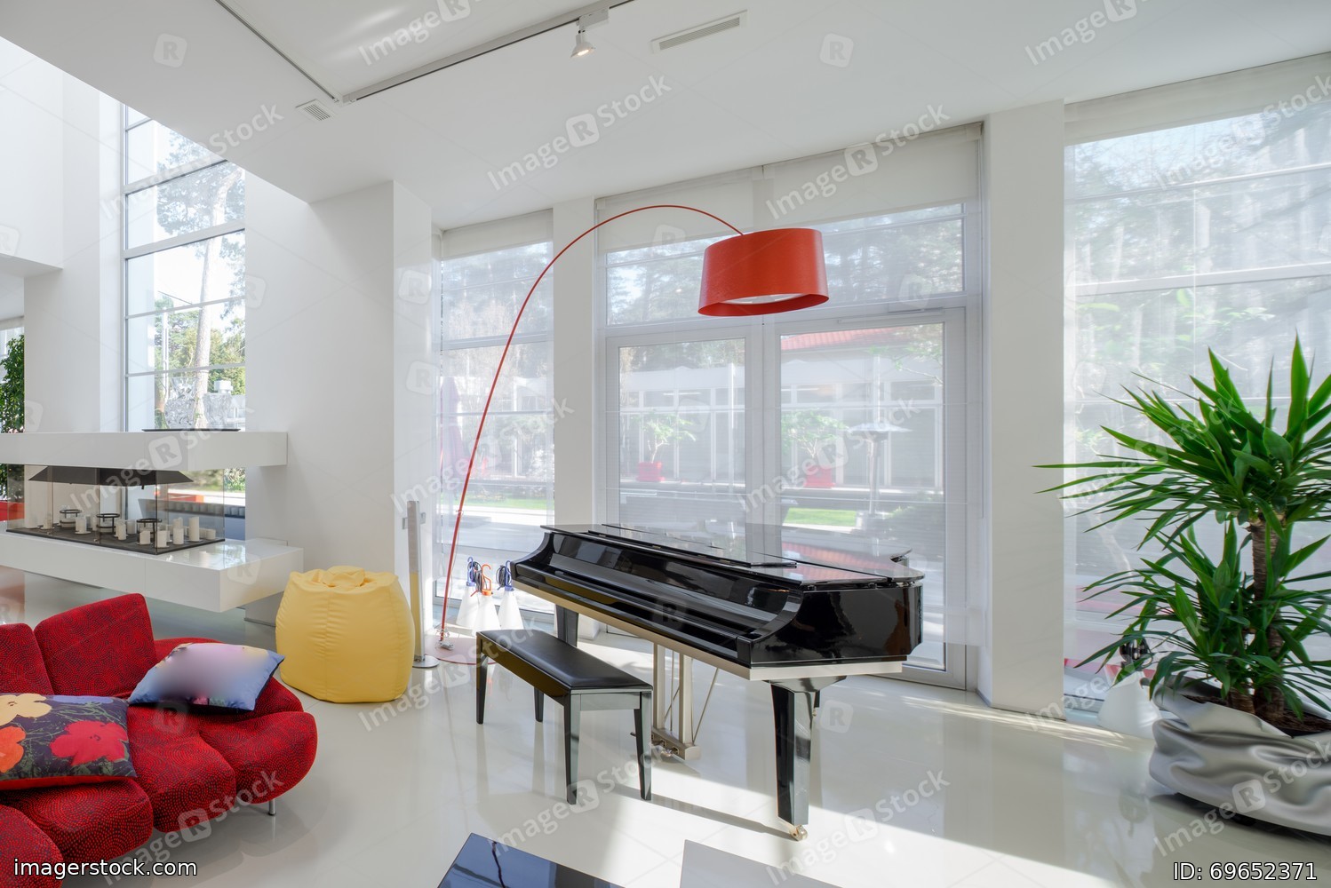 Modern interior. Luxury private house. Living room. Red sofa, piano