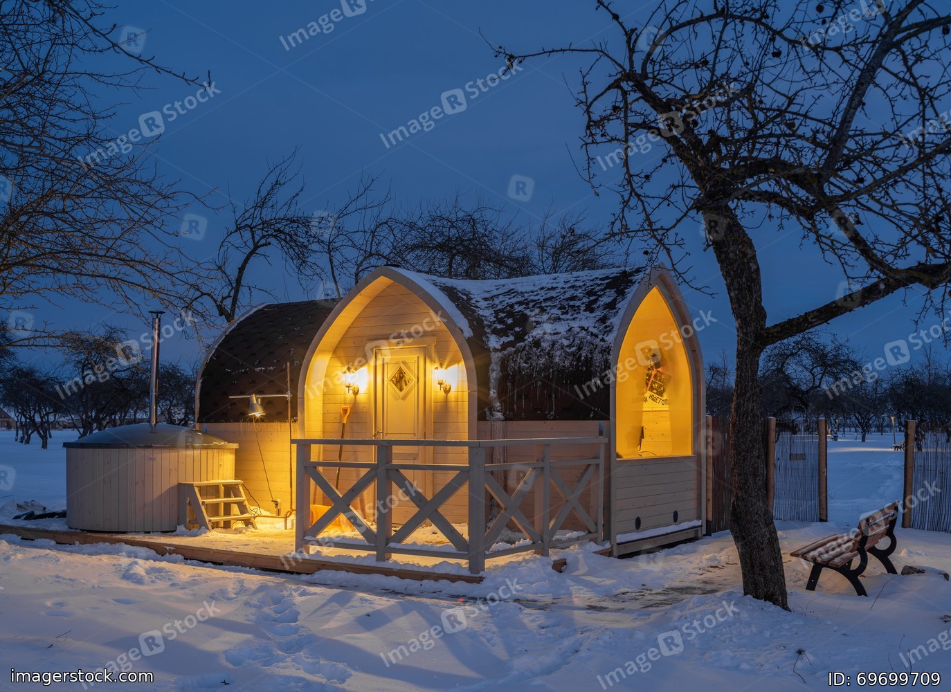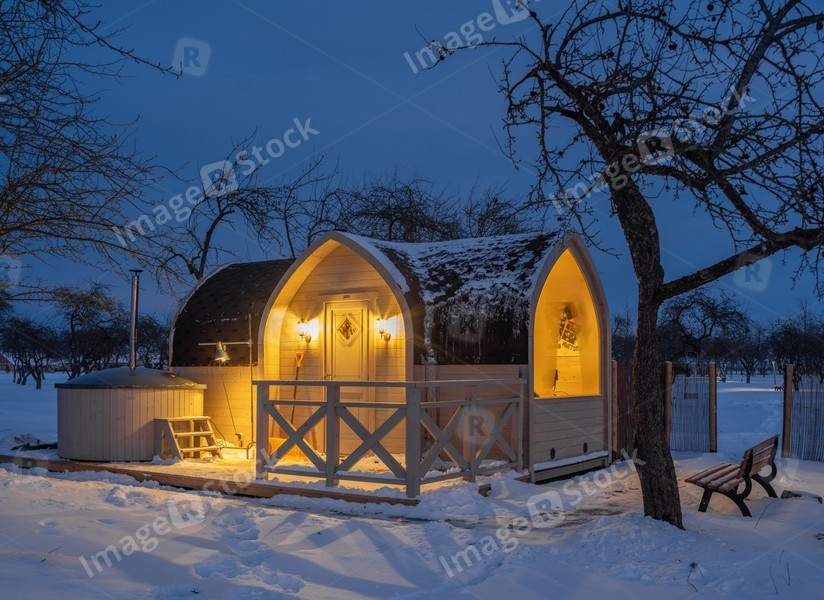 Wooden cabin (finnish sauna) at winter night.