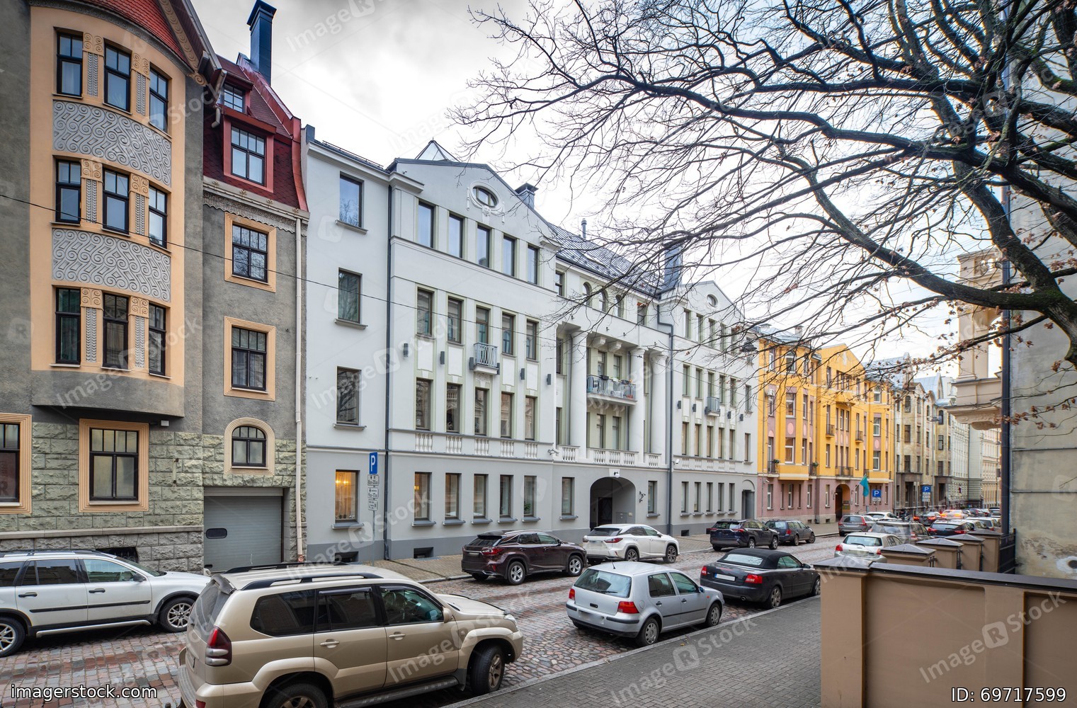 Modern buildings on the city street. Riga, Latvia. Car parking. Art Nouveau architecture.
