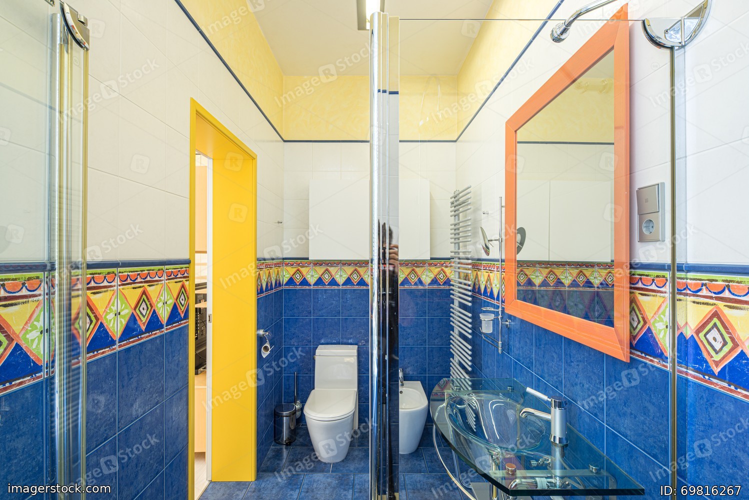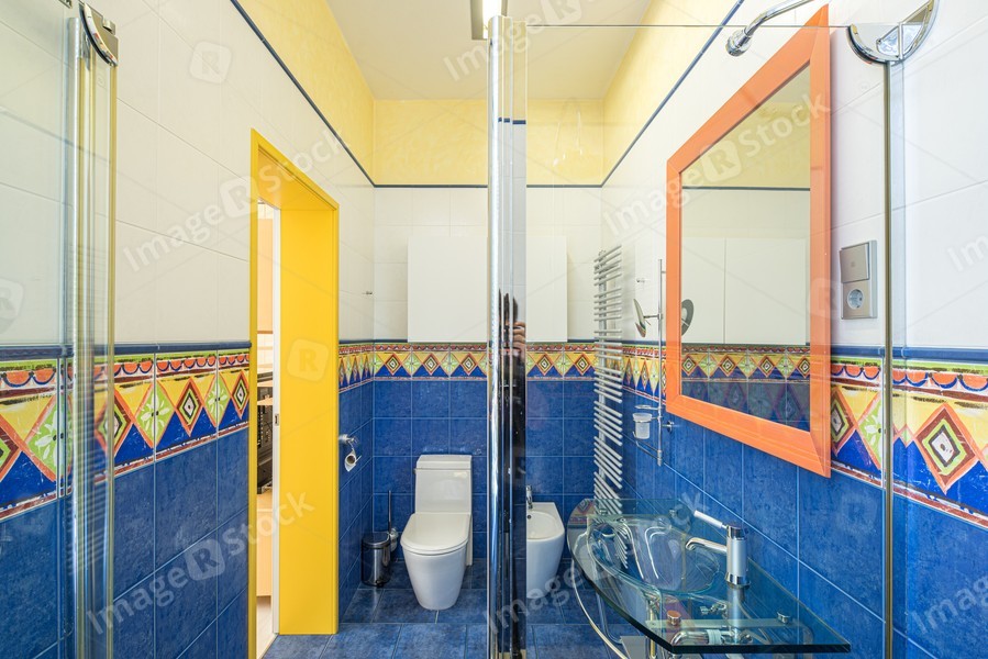 Modern interior of bathroom in luxury apartment. Blue and yellow.