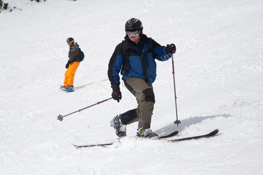 A man goes skiing on a snow-covered ski track. Ski resort. A man on snowboard. Winter sport.