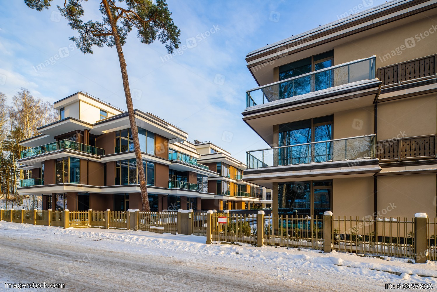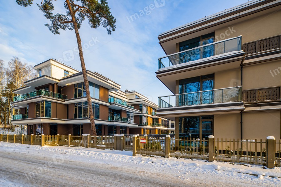 Modern exterior of new luxury residential building at winter.