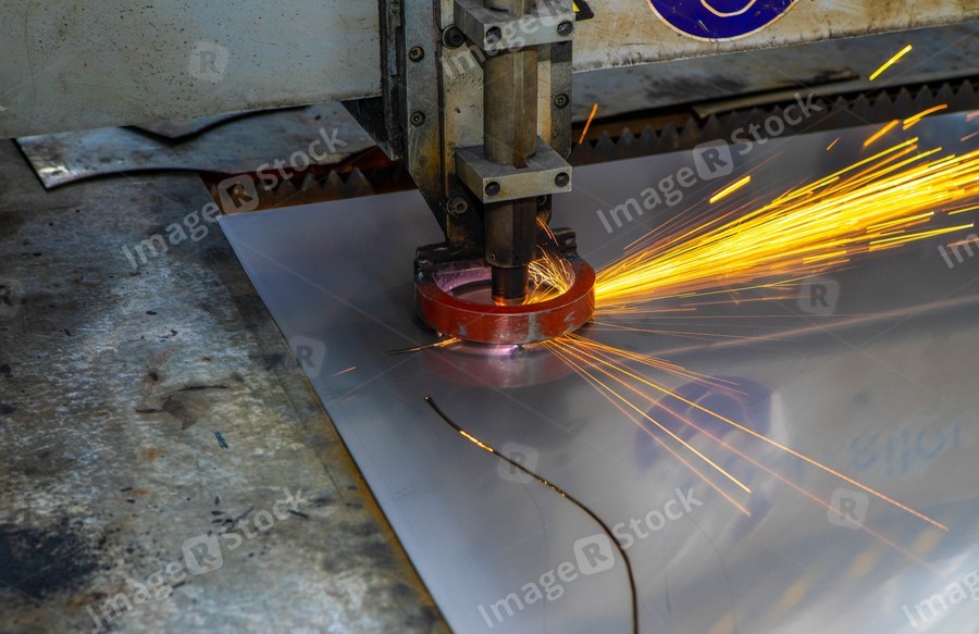Plasma cutting of metal. Sparks fly from laser.