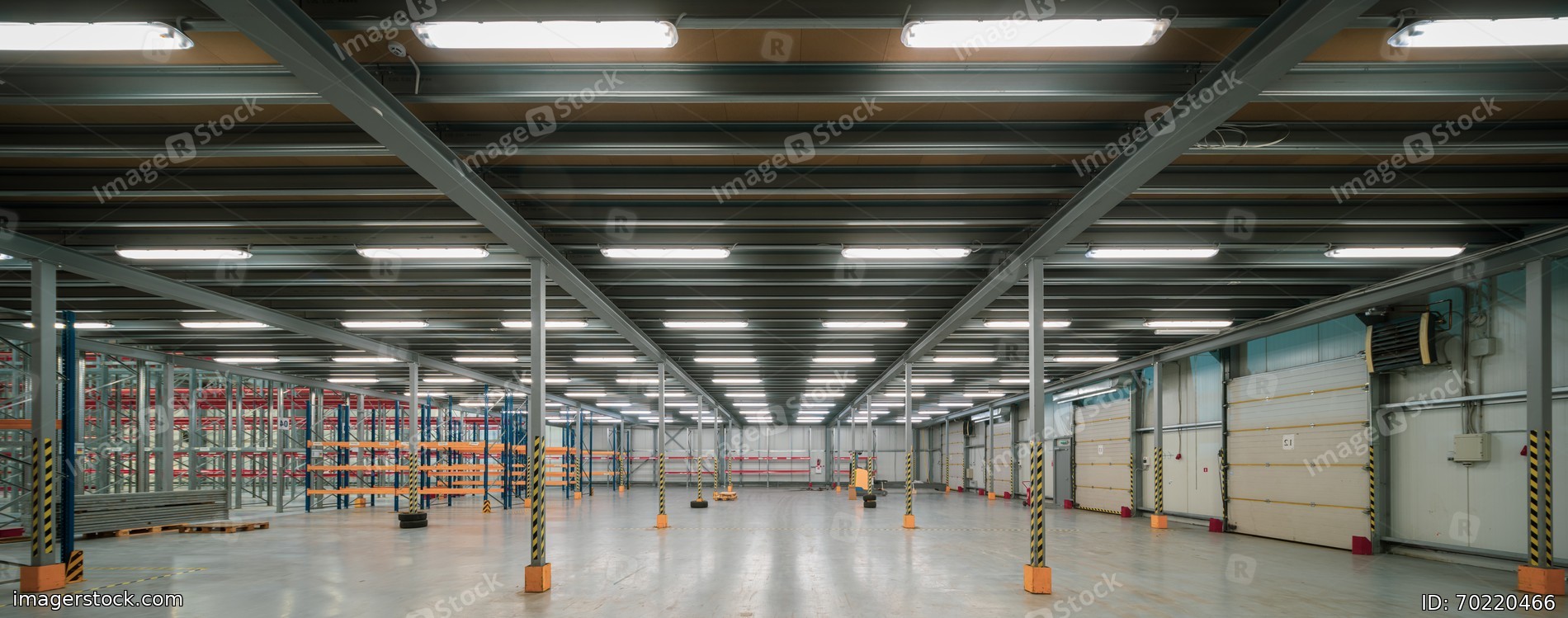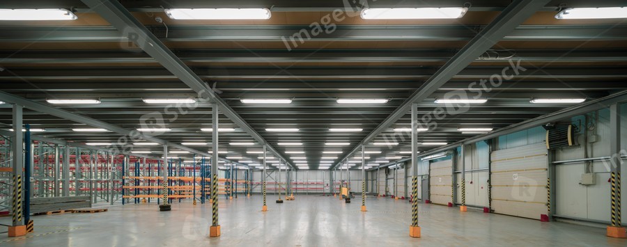 Interior of huge empty storehouse. Industrial warehouse racking.
