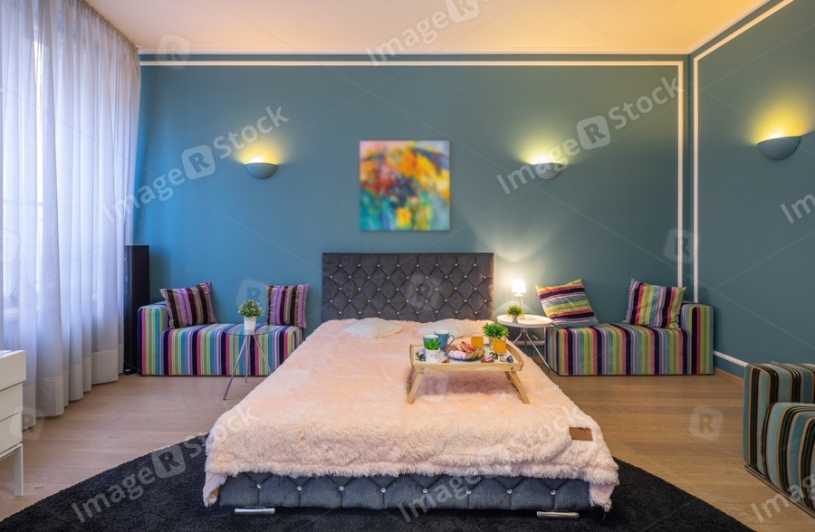 Modern interior of spacious studio apartment. Bedroom. King-size bed.