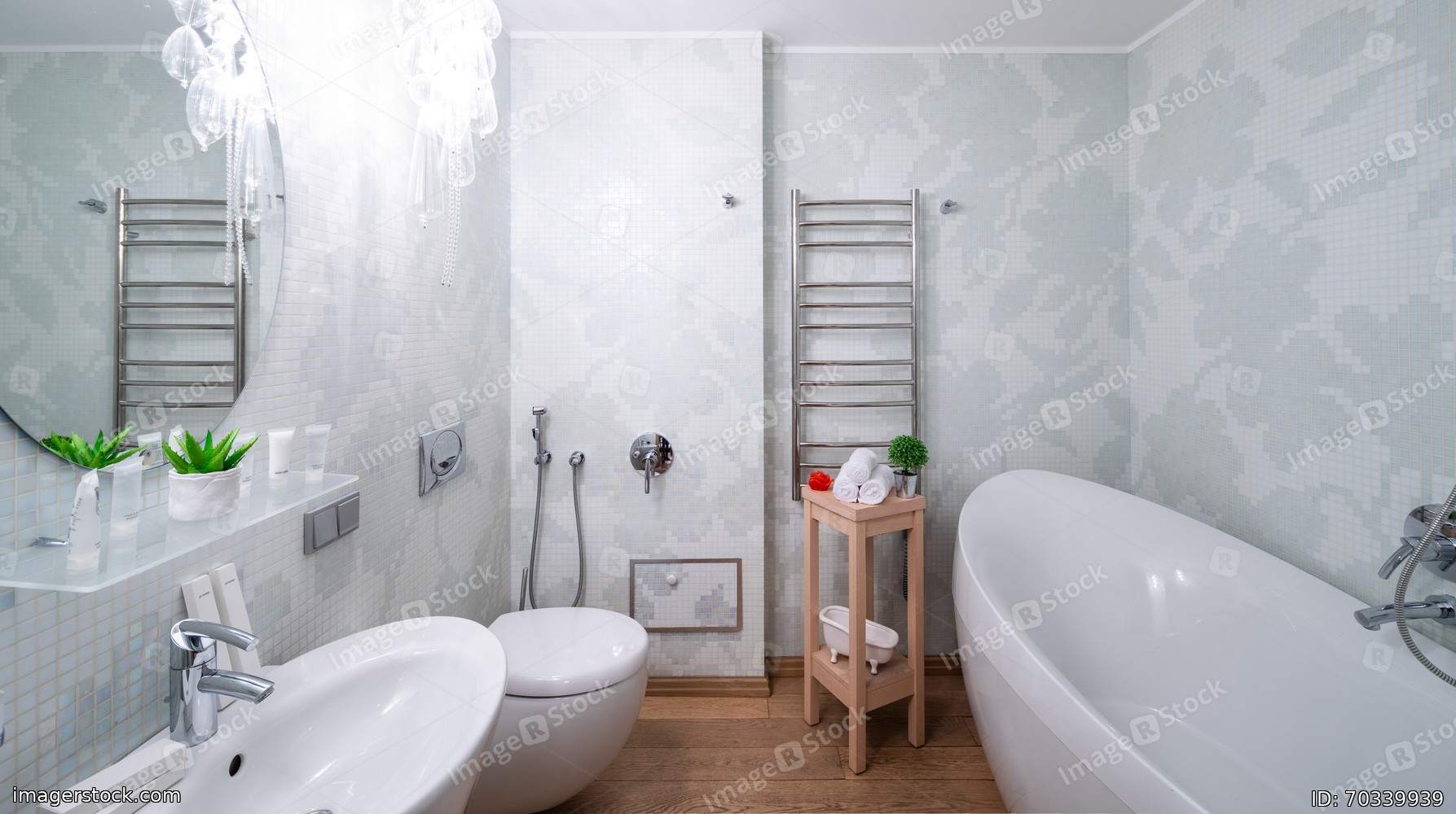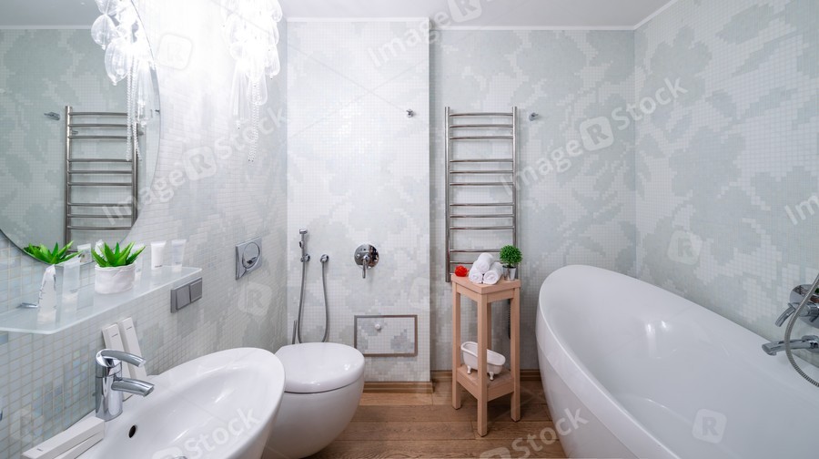 Light spacious bathroom. White tile with pattern.