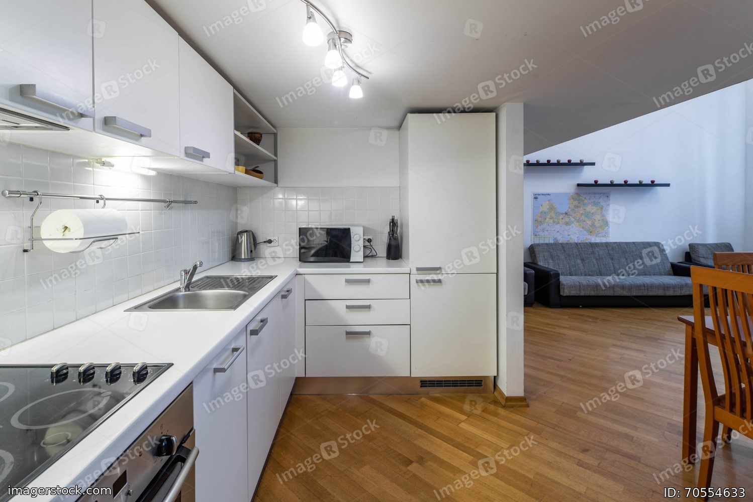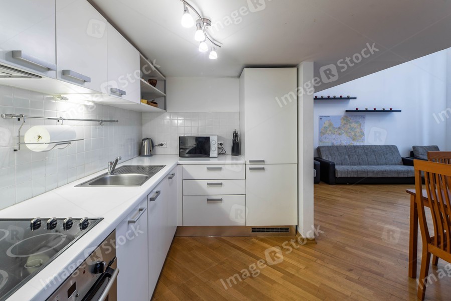 White kitchen set. Cozy sofa. Wooden floor. Private house.