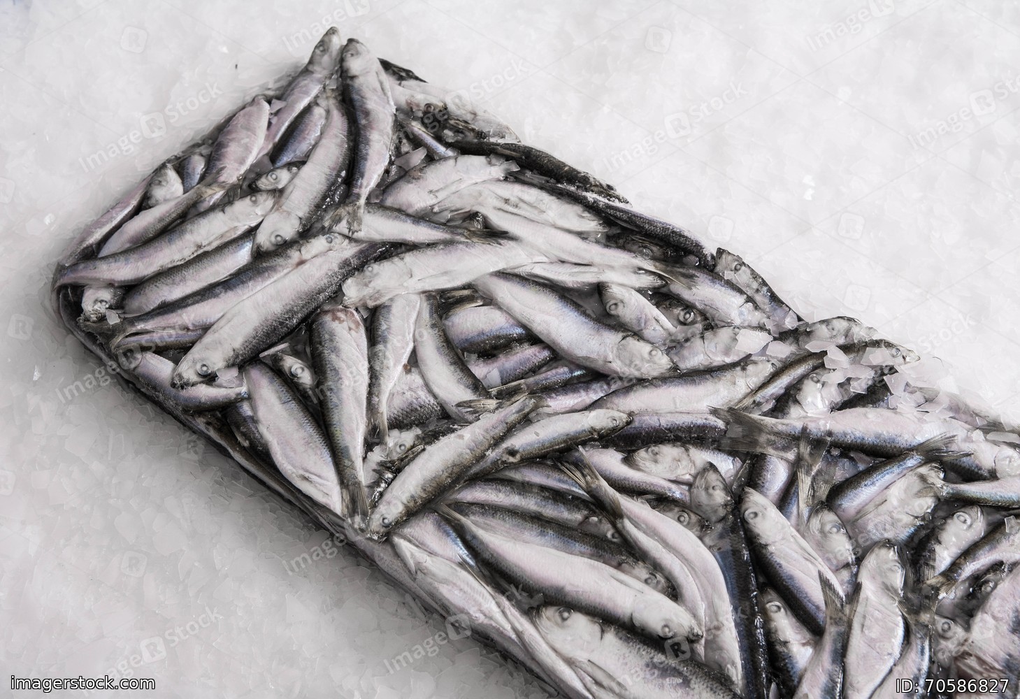 Close-up of sprat brick on the ice in fish market. Winter fishing. Frozen small silver fish production.