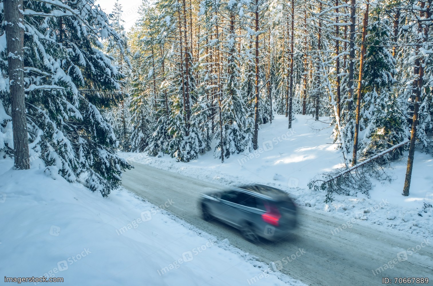 Scenic landscape of winter forest. Trees covered by snow. Car on road.