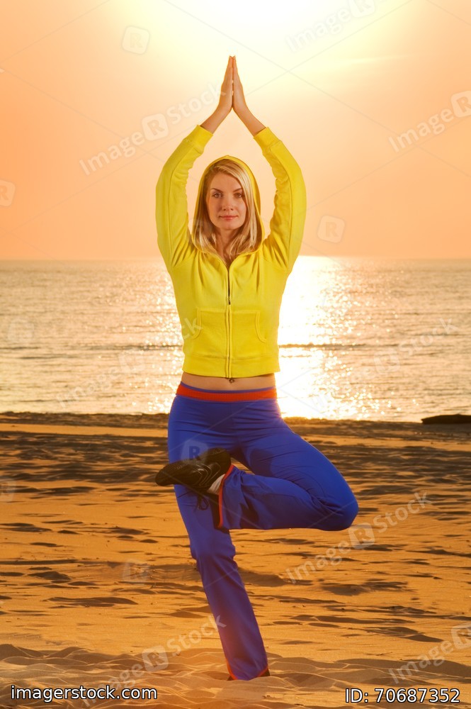 Beautiful young woman doing fitness exercise on a beach at sunset