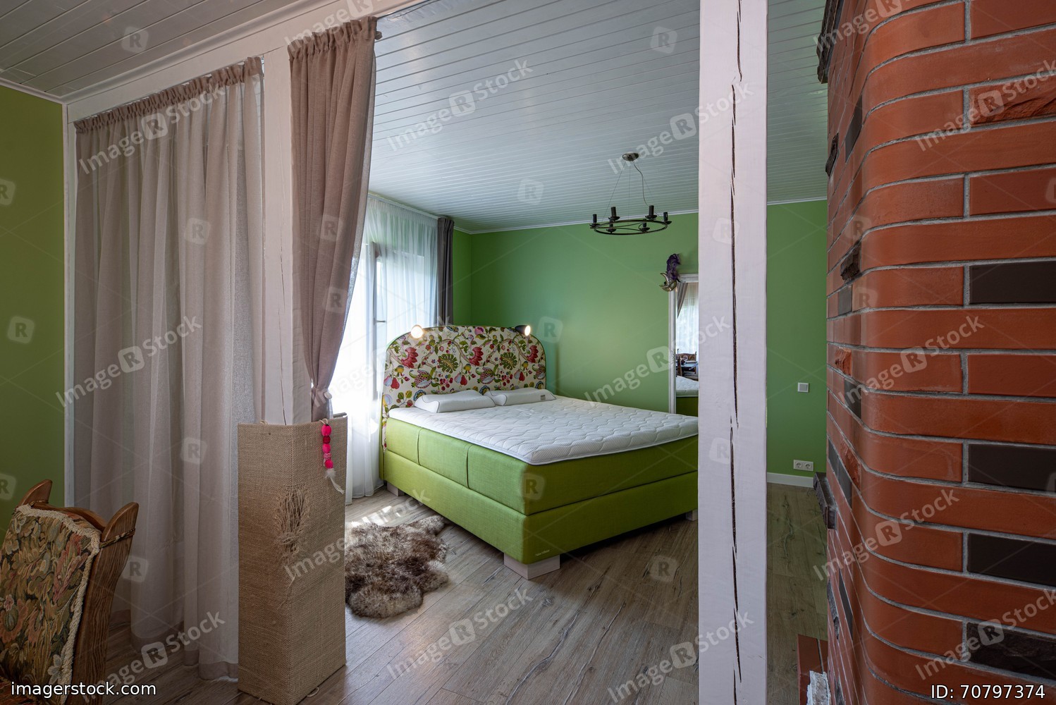 Huge bed in modern bedroom. Luxury interior. Private house. Green walls.