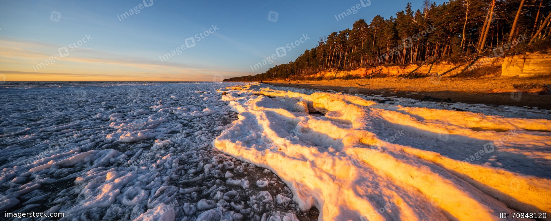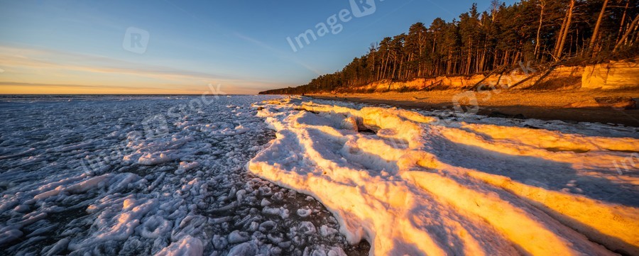 Snow and ice in sunset light on Baltic sea shore. Winter nature.