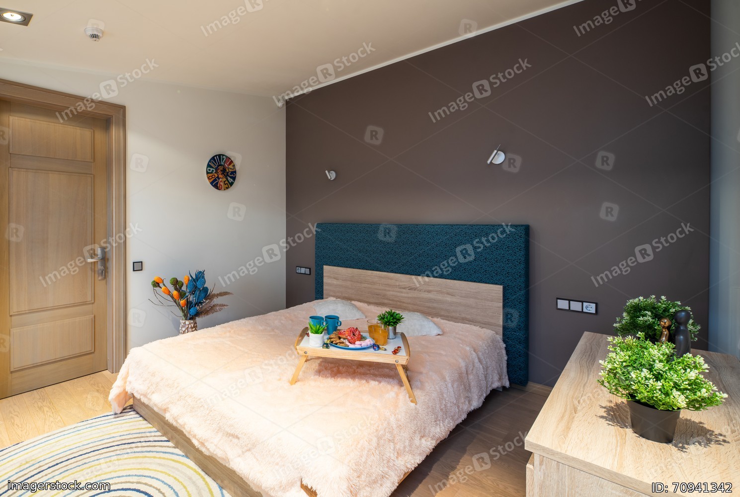 Interior of bedroom. Modern apartment. King-size bed. Tray with food.