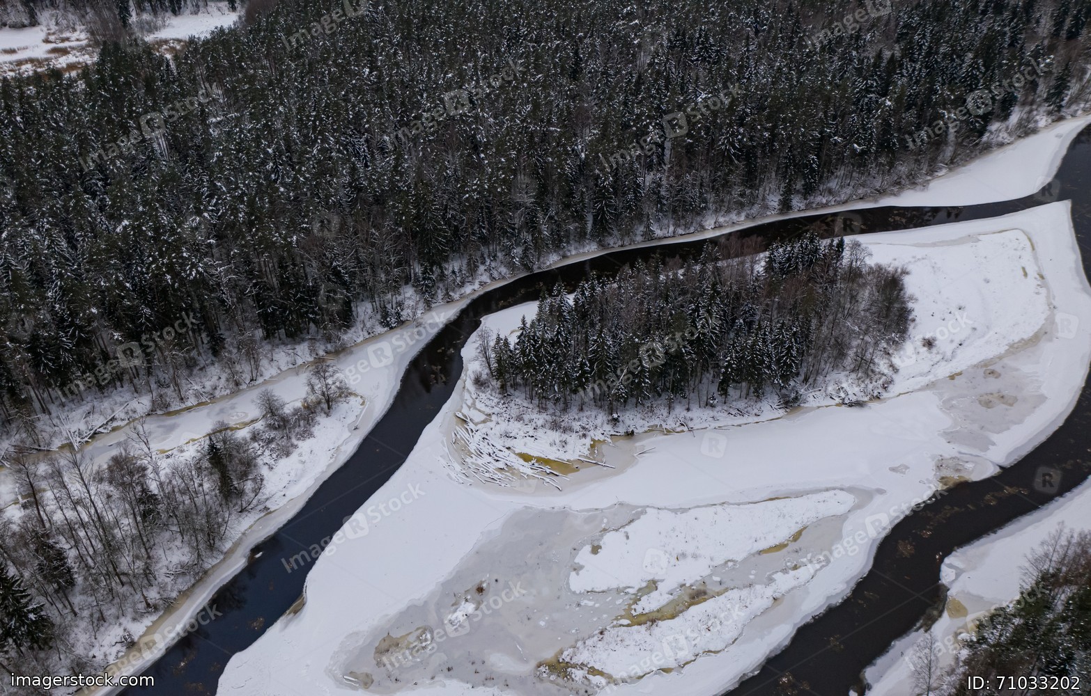 Aerial view of winter landscape. River, forest and snow.
