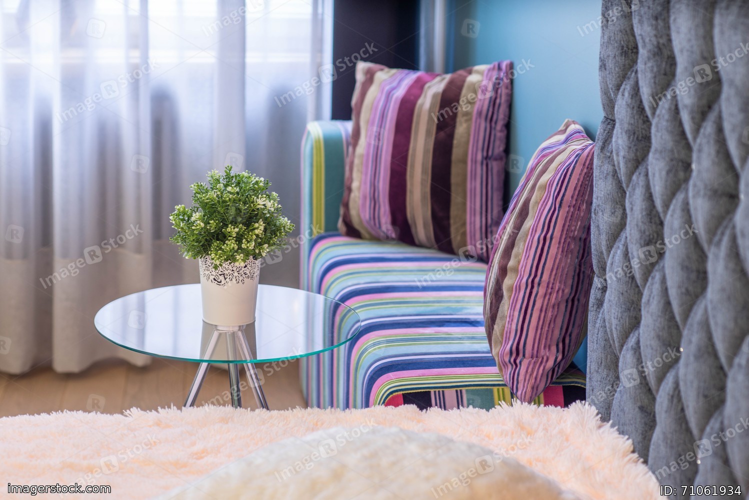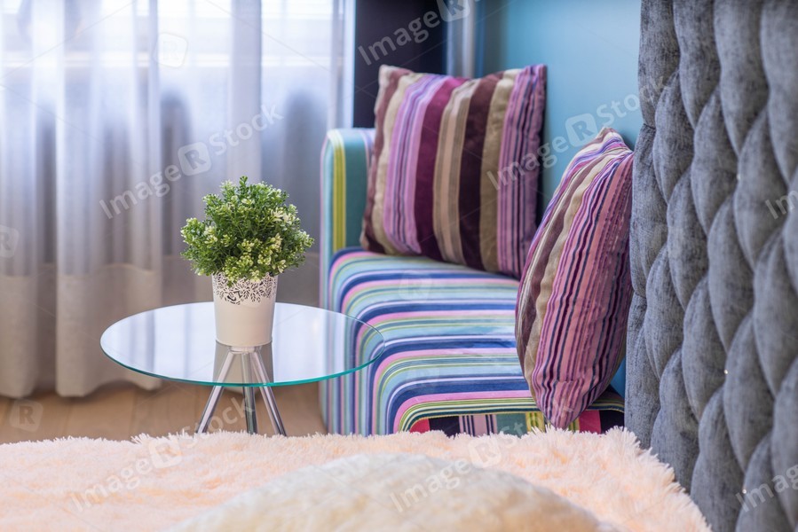 Flower on the glass table in interior of modern apartment. Bedroom.