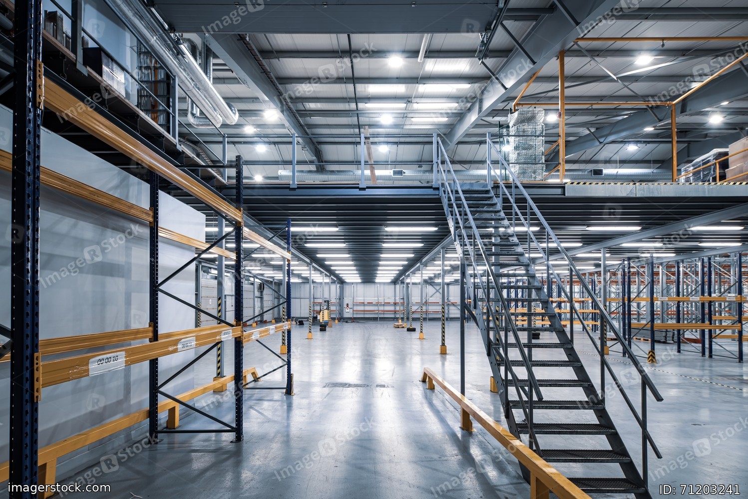 Interior of huge empty storehouse. Industrial warehouse racking.