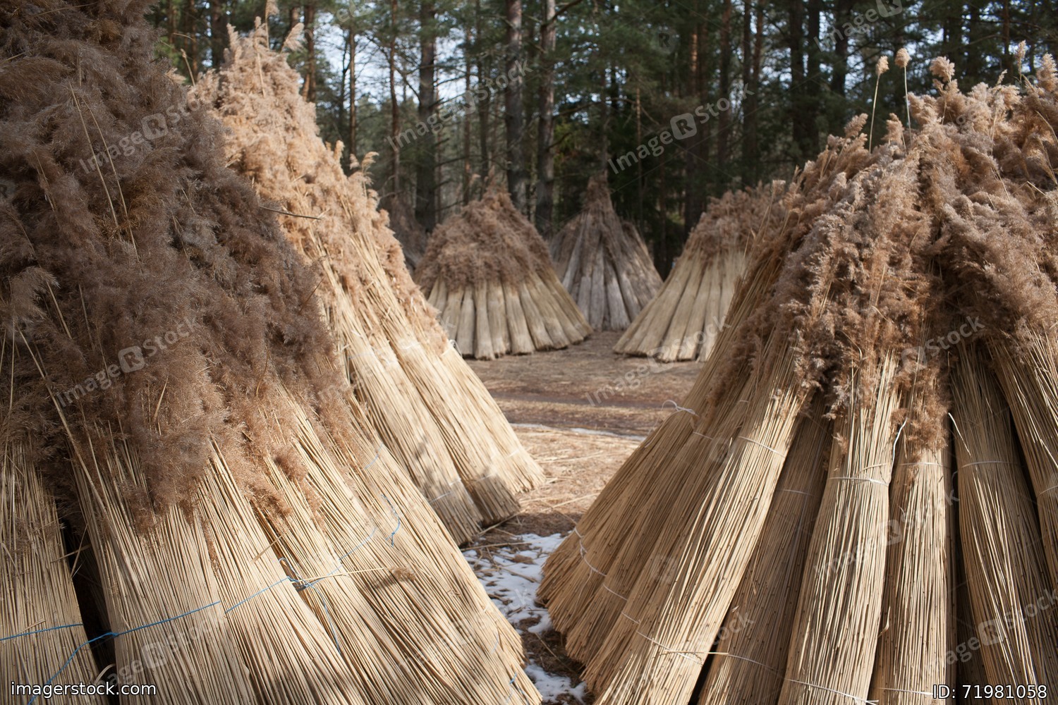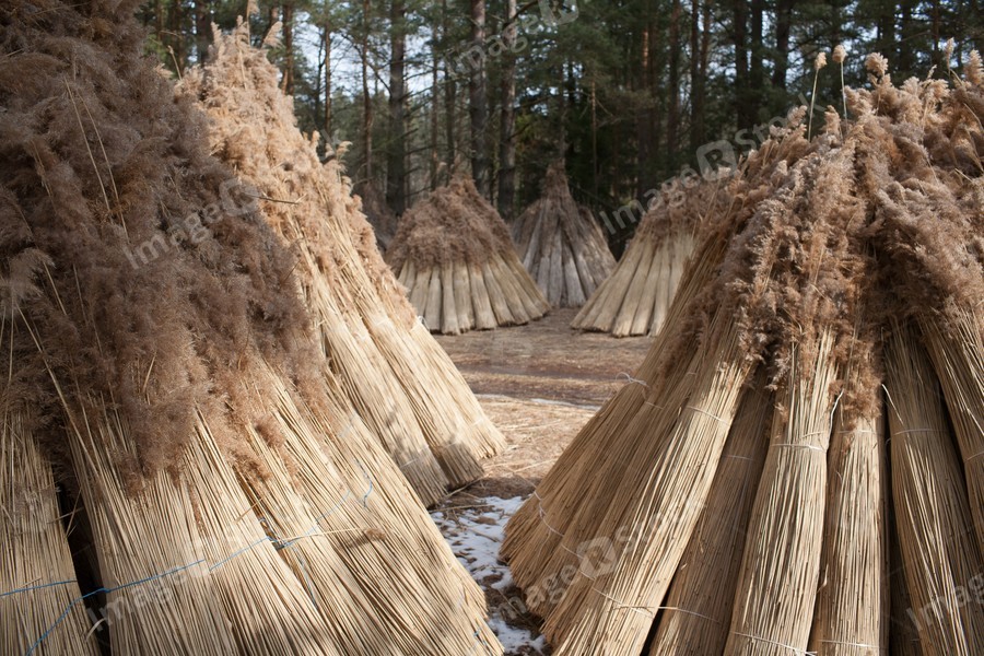 Harvesting cane for making roofs. Winter landscape.