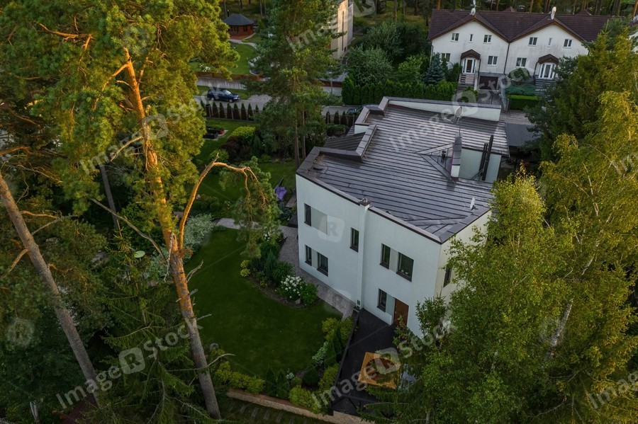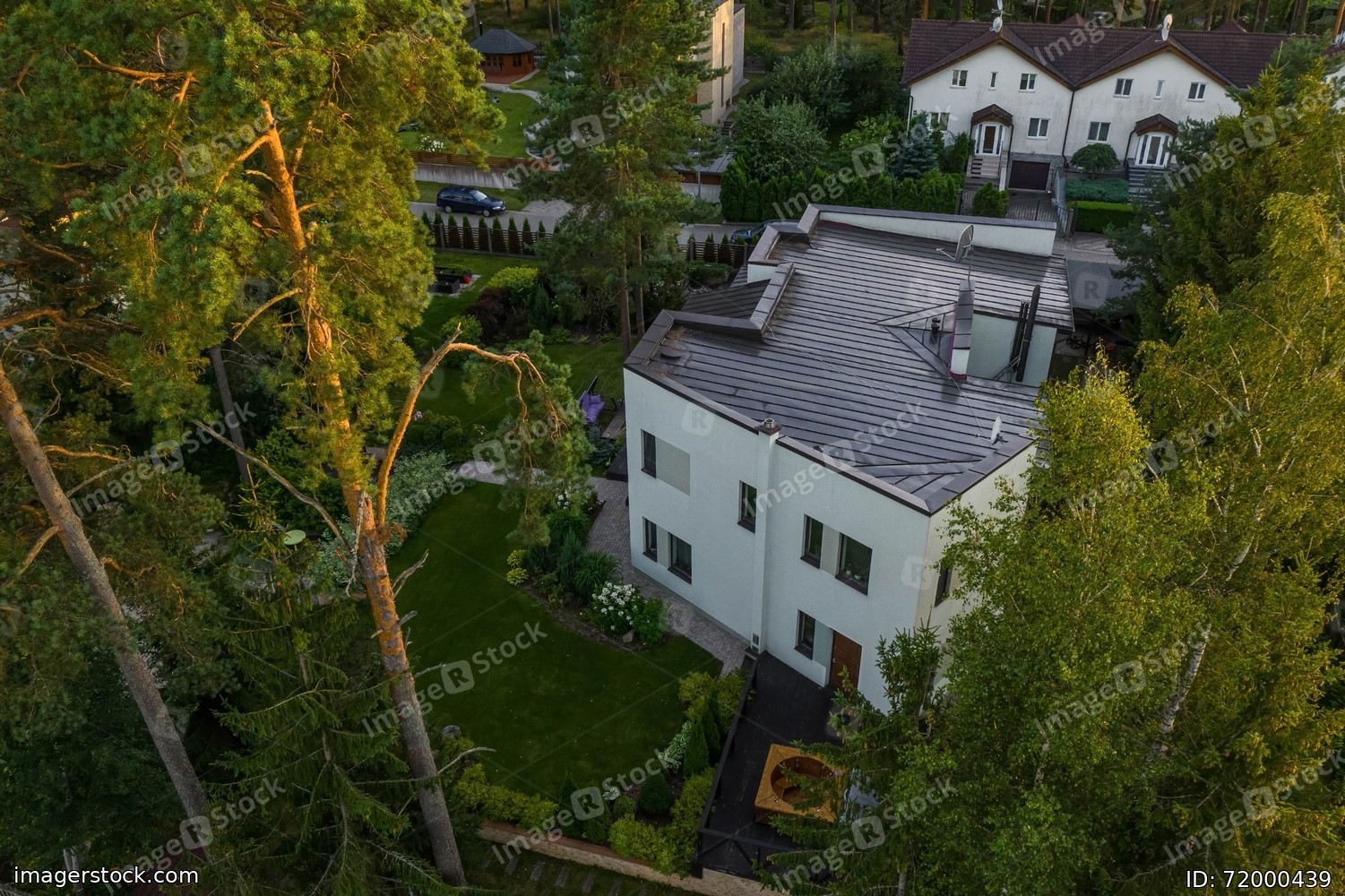 Top drone view of private house in cottage village. Modern exterior. Green trees.