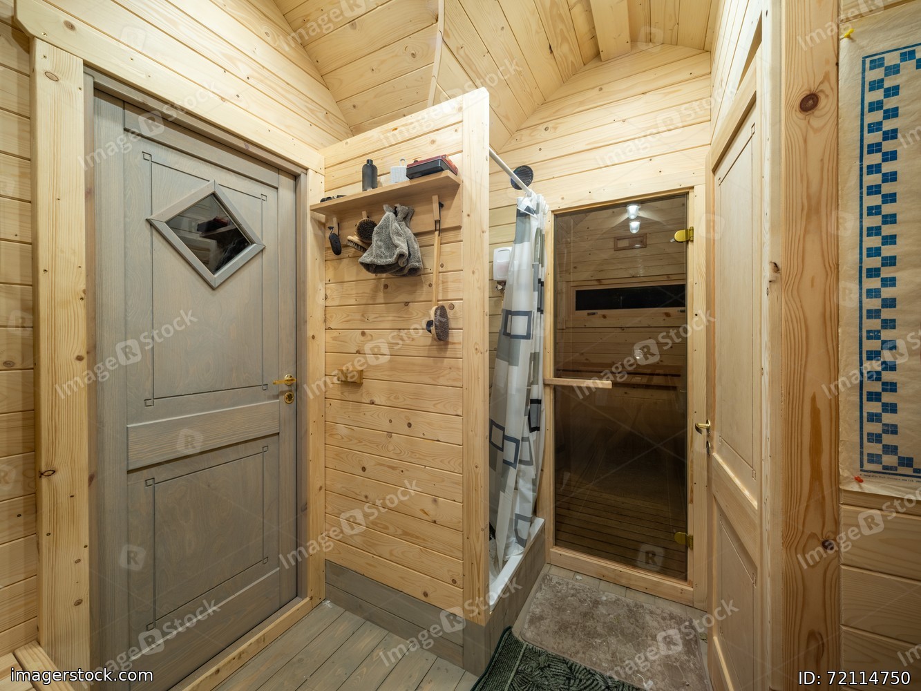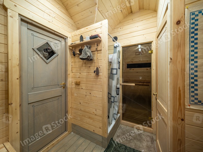 Wooden interior of modern bathhouse. Shower and door to sauna.