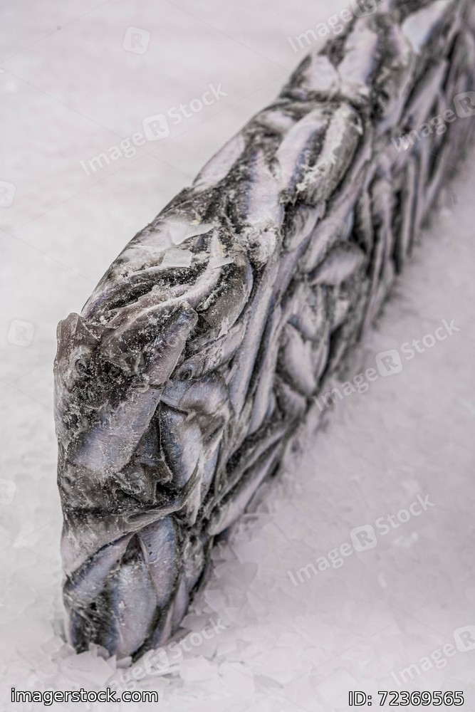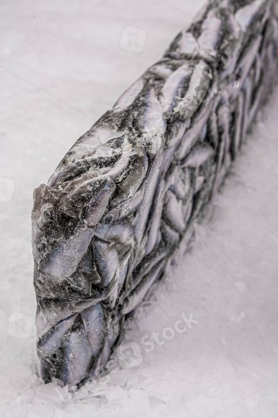 Close-up of sprat brick on the ice in fish market. Winter fishing. Frozen small silver fish. Top side view.