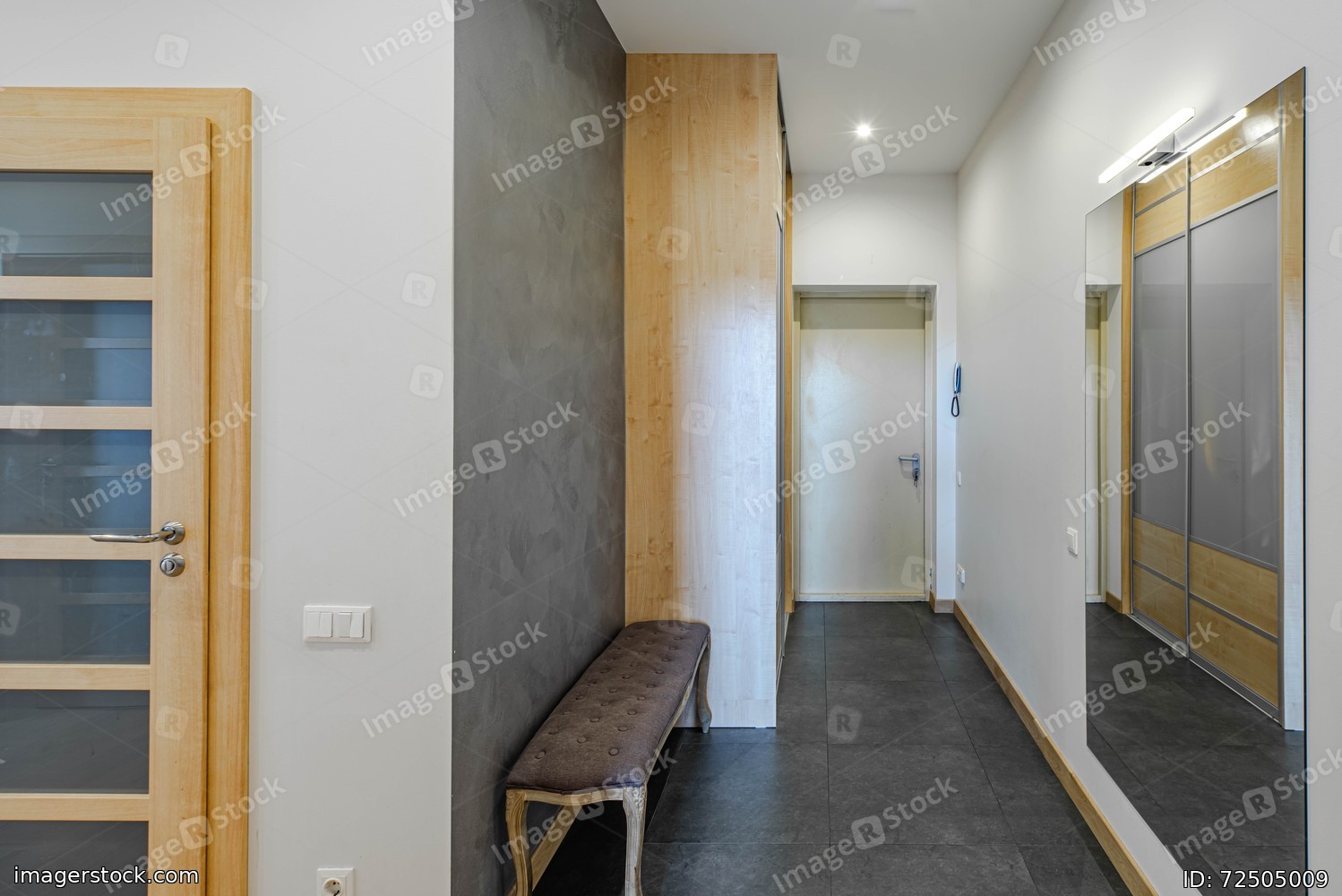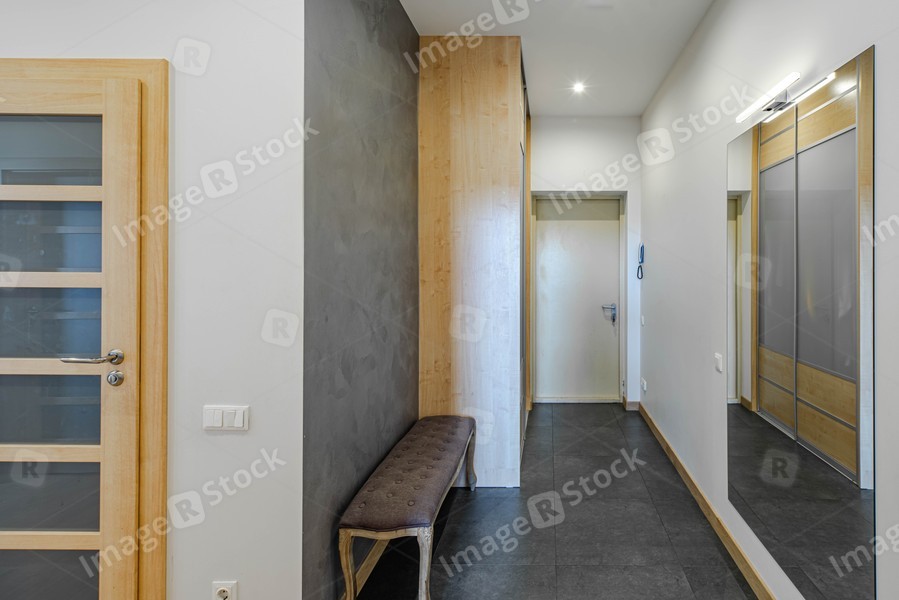 Contemporary interior of entrance hall in luxury flat. White walls. Wooden wardrobe. Mirror and lamp.