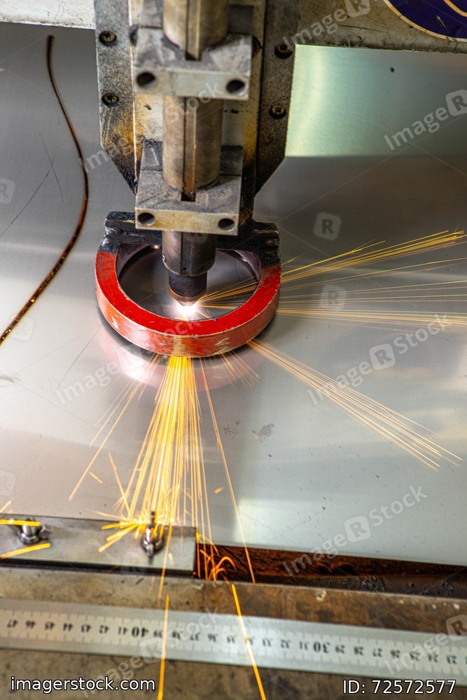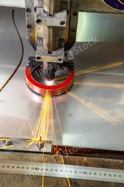 Plasma cutting of metal. Sparks fly from laser.
