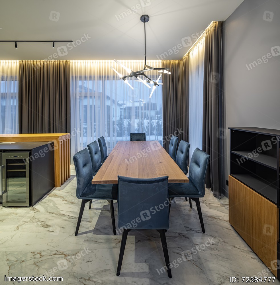 Huge wooden table and chairs. Interior of luxury kitchen in house.