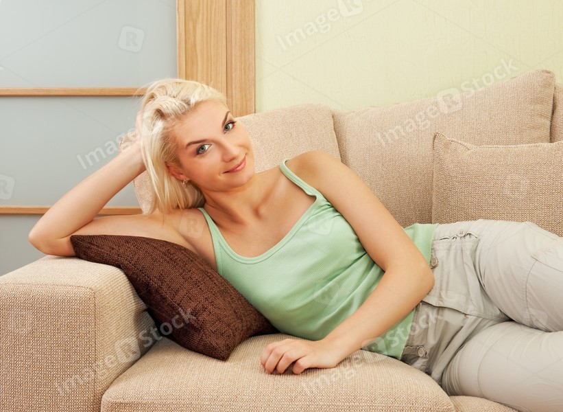 Happy young woman lying on sofa