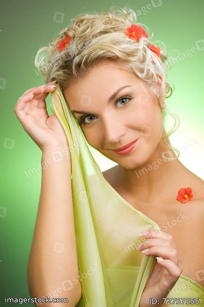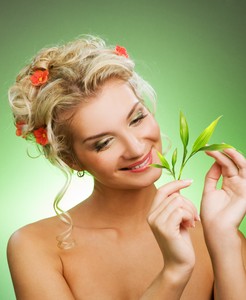 Beautiful young woman with fresh flowers in her hair. Spring concept.