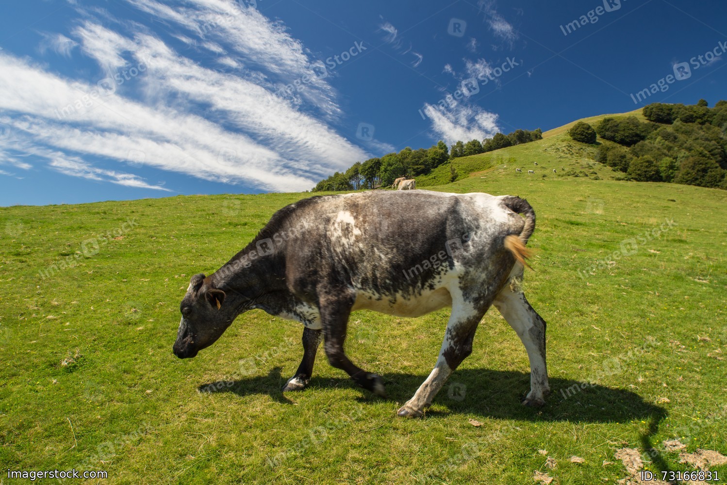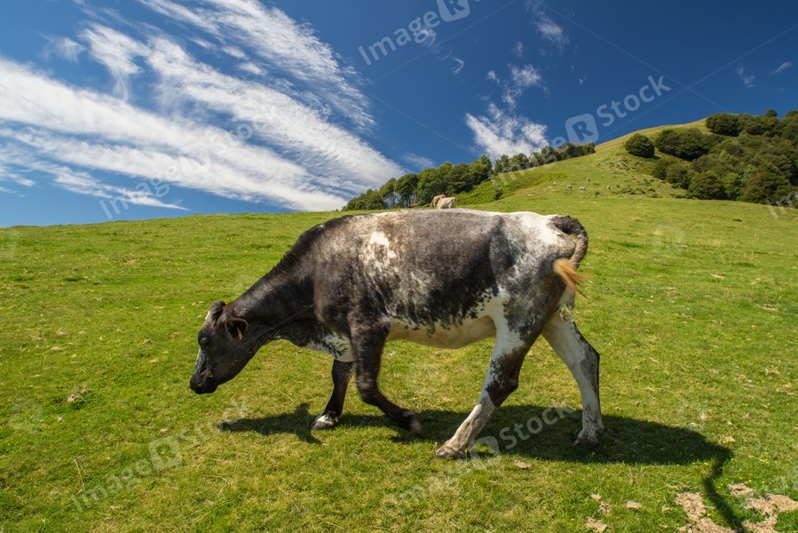 The pasture in the mountains. Cows grazing on the hills. Italy.