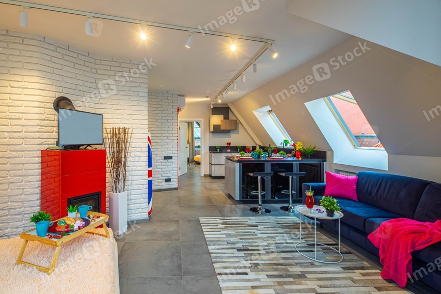 Modern loft interior of flat. Luxury studio apartment with furniture. Set table. TV on the fireplace. Brick wall.