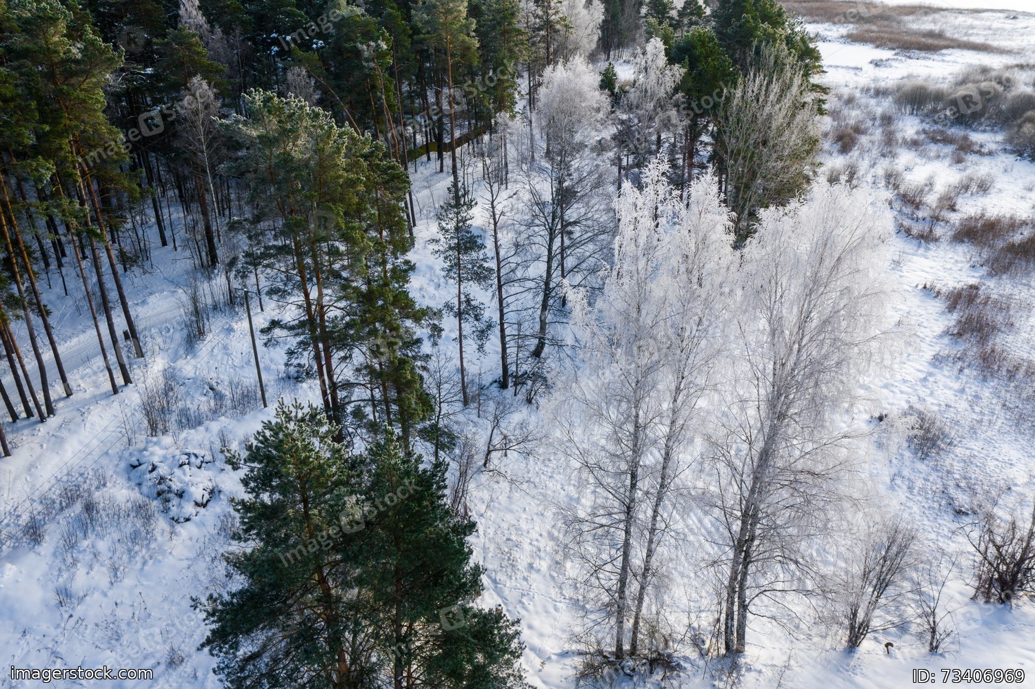 Beautiful winter nature. Scenic landscape. Top drone view of snowy forest.