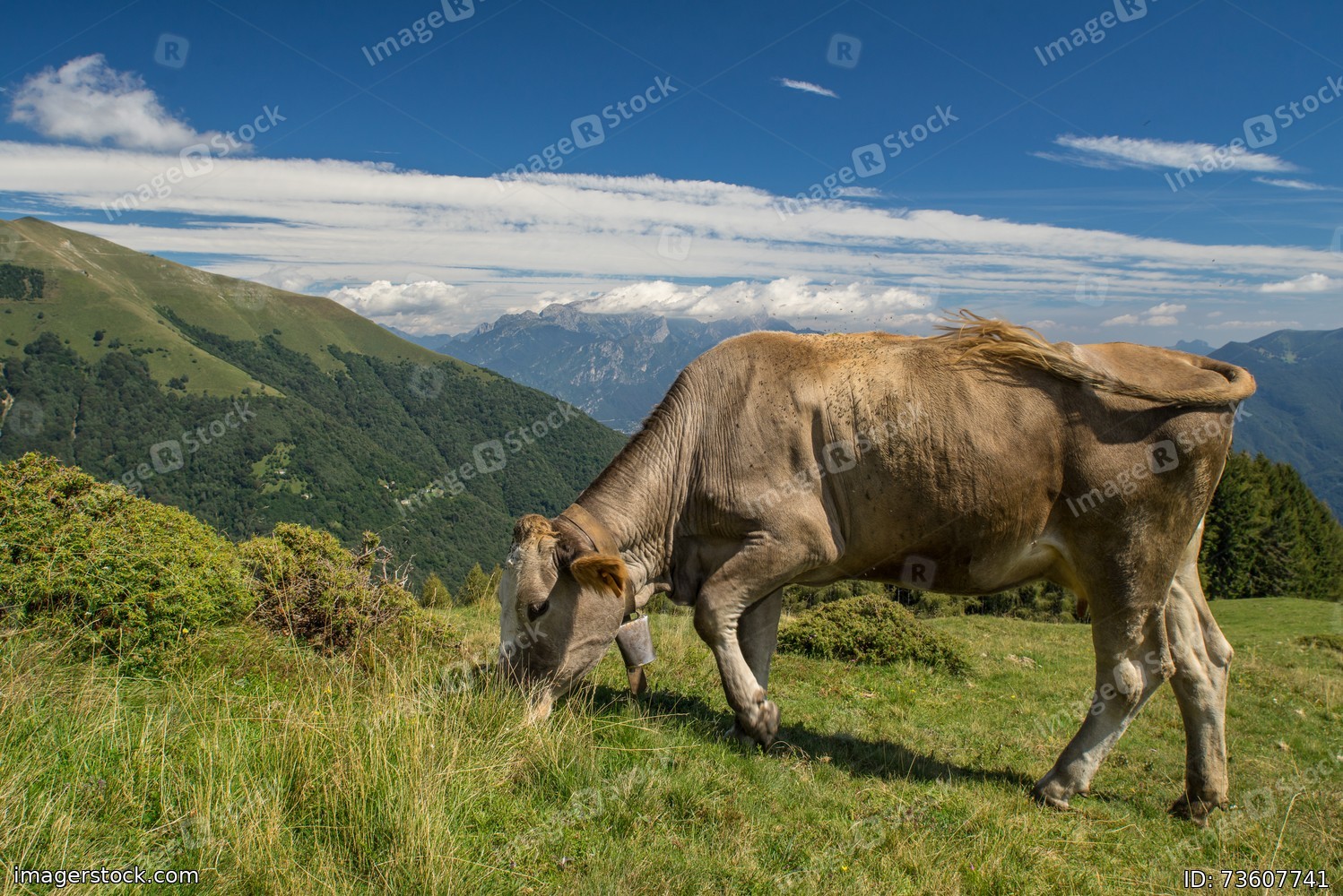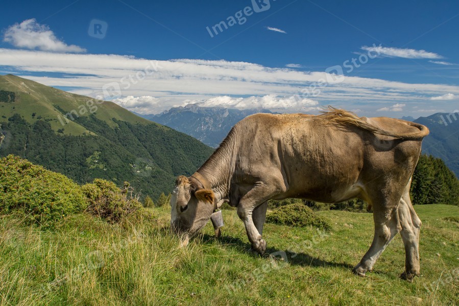 The pasture in the mountains. Cows grazing on the hills. Italy.