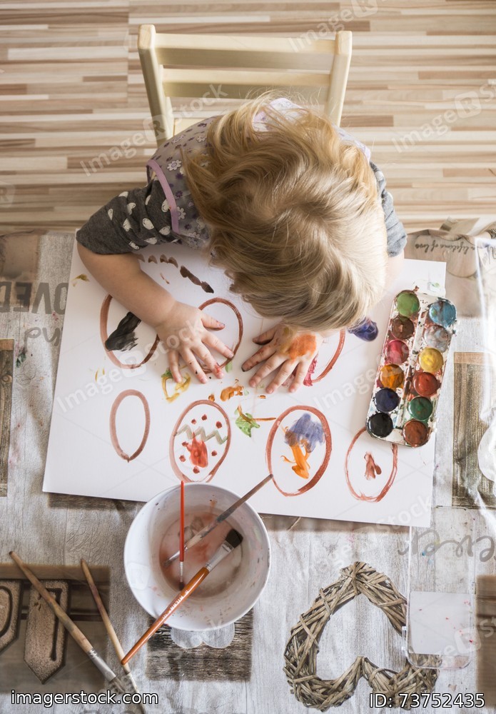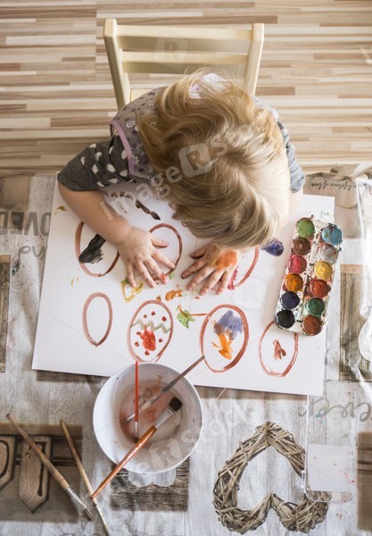 Little girl draws and decorates Easter eggs with water colors