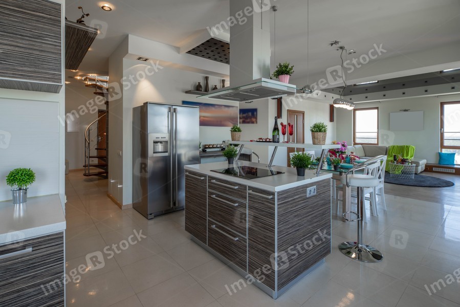 Modern interior of studio apartment in light tones. Living room and kitchen.