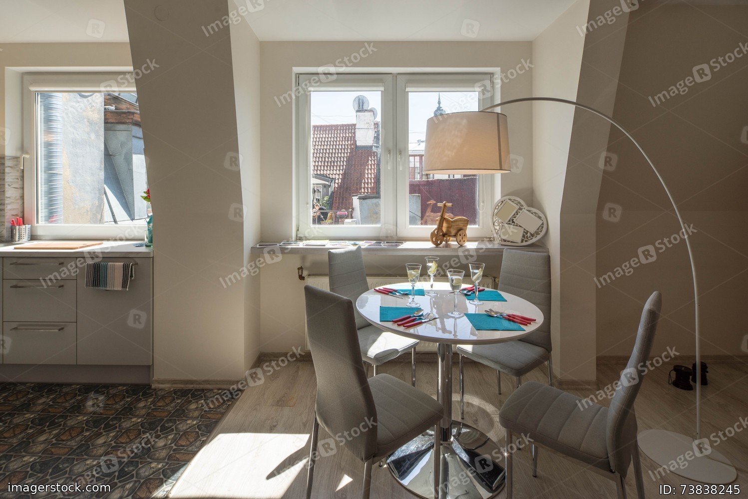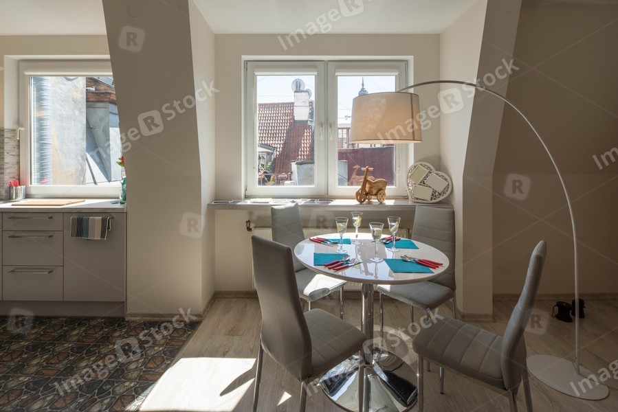 Light interior of kitchen with white walls and windows. Table and four chairs. Close-up.