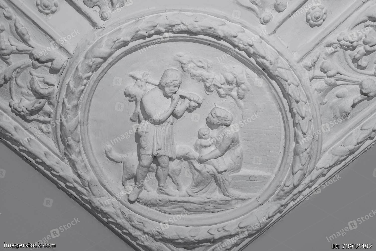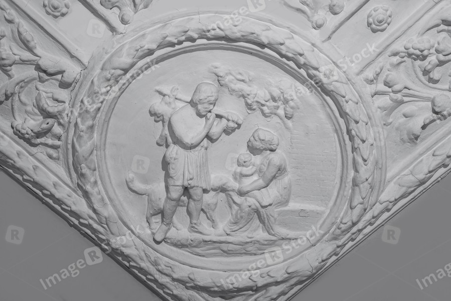 Retro moldings on the ceiling around the room. The old gypsum rosette on the celling.
