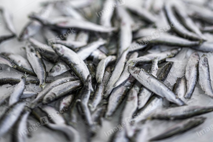 Close-up of fresh sprat on the ice in fish market. Winter fishing. Small silver fish production.