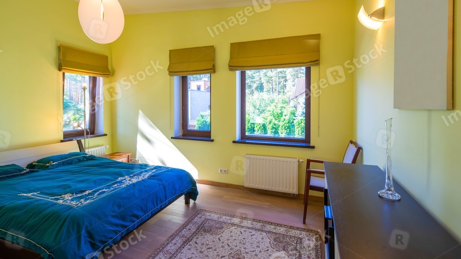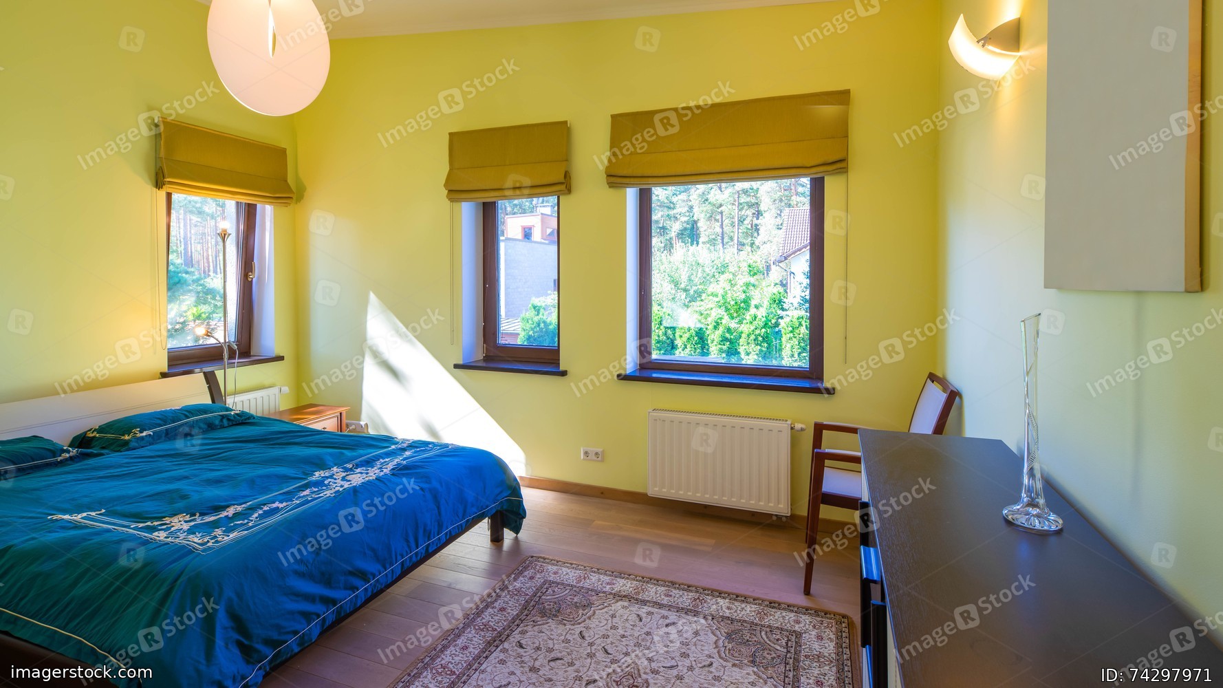 Contemporary interior of bedroom with yellow walls in cottage. Wooden furniture. Cozy bed.