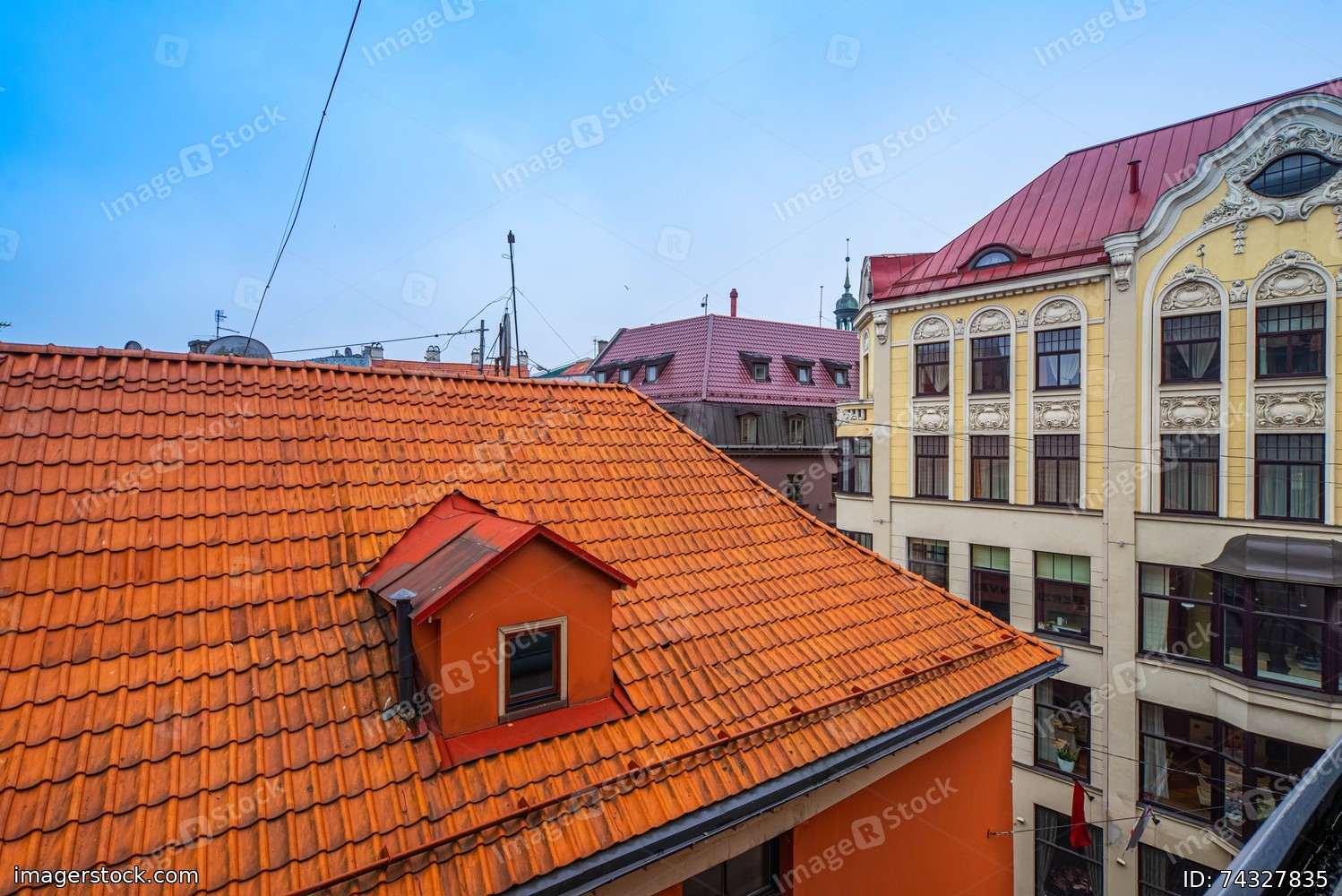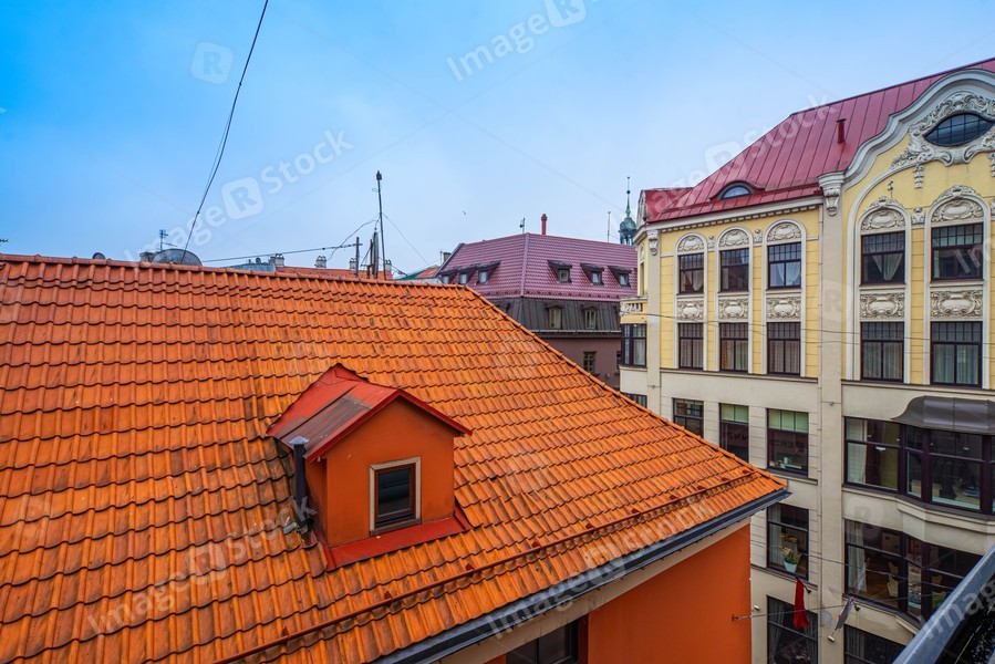 Traditional architecture of Old town of Riga, Latvia. Close-up of red tile roof. Modern exterior.