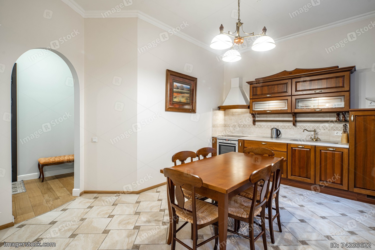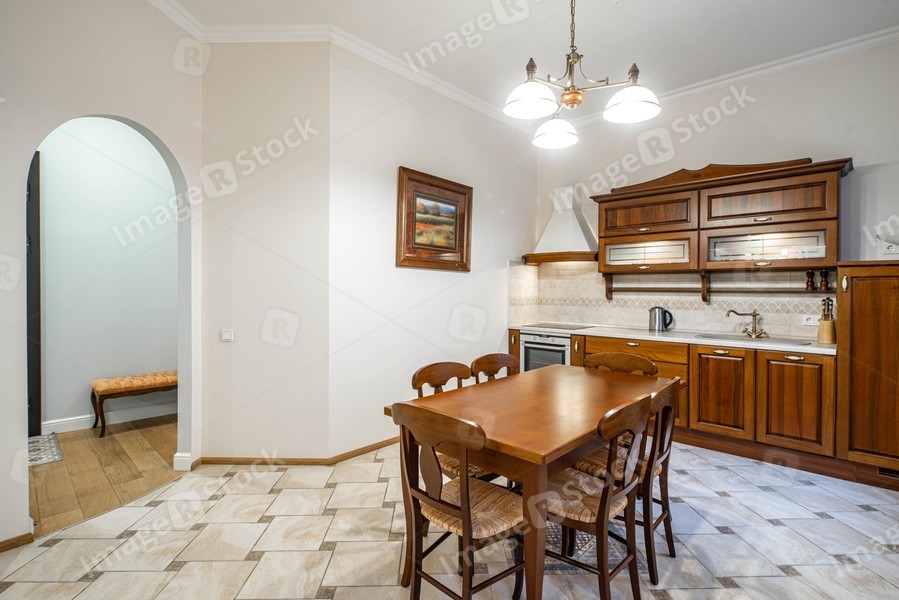 Wooden furniture and kitchen set in luxury kitchen interior. Arch.