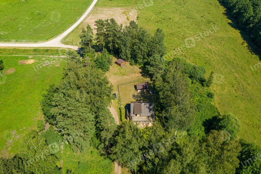 Drone view from above of private country house with territory between green trees near the forest. Sunny summer day.