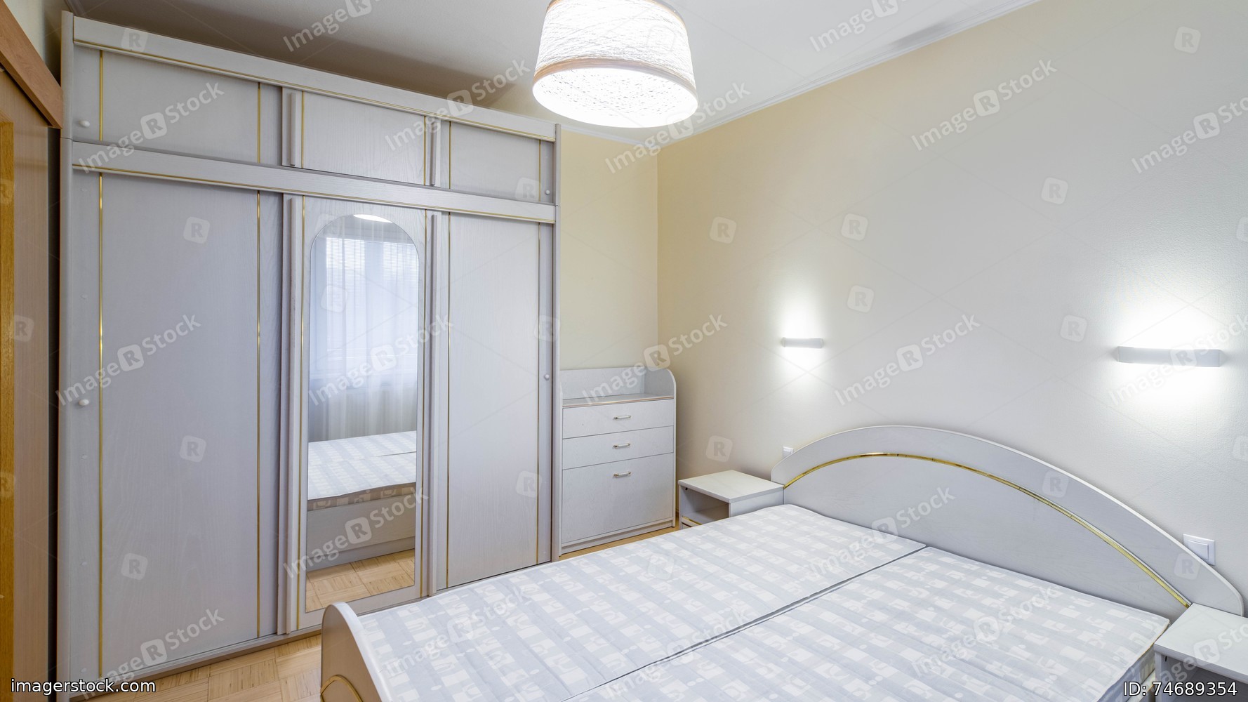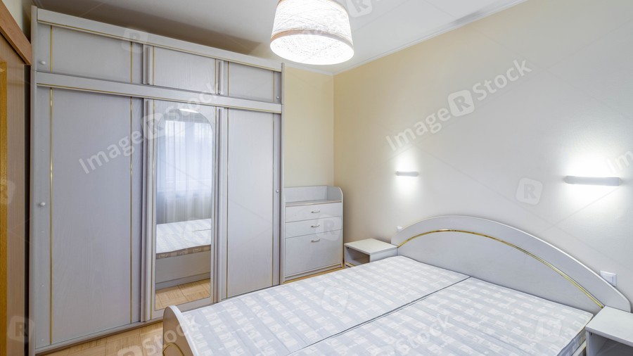 Modern interior of bedroom in apartment. Sliding door wardrobe with mirror. White dresser, bed and nightstands.