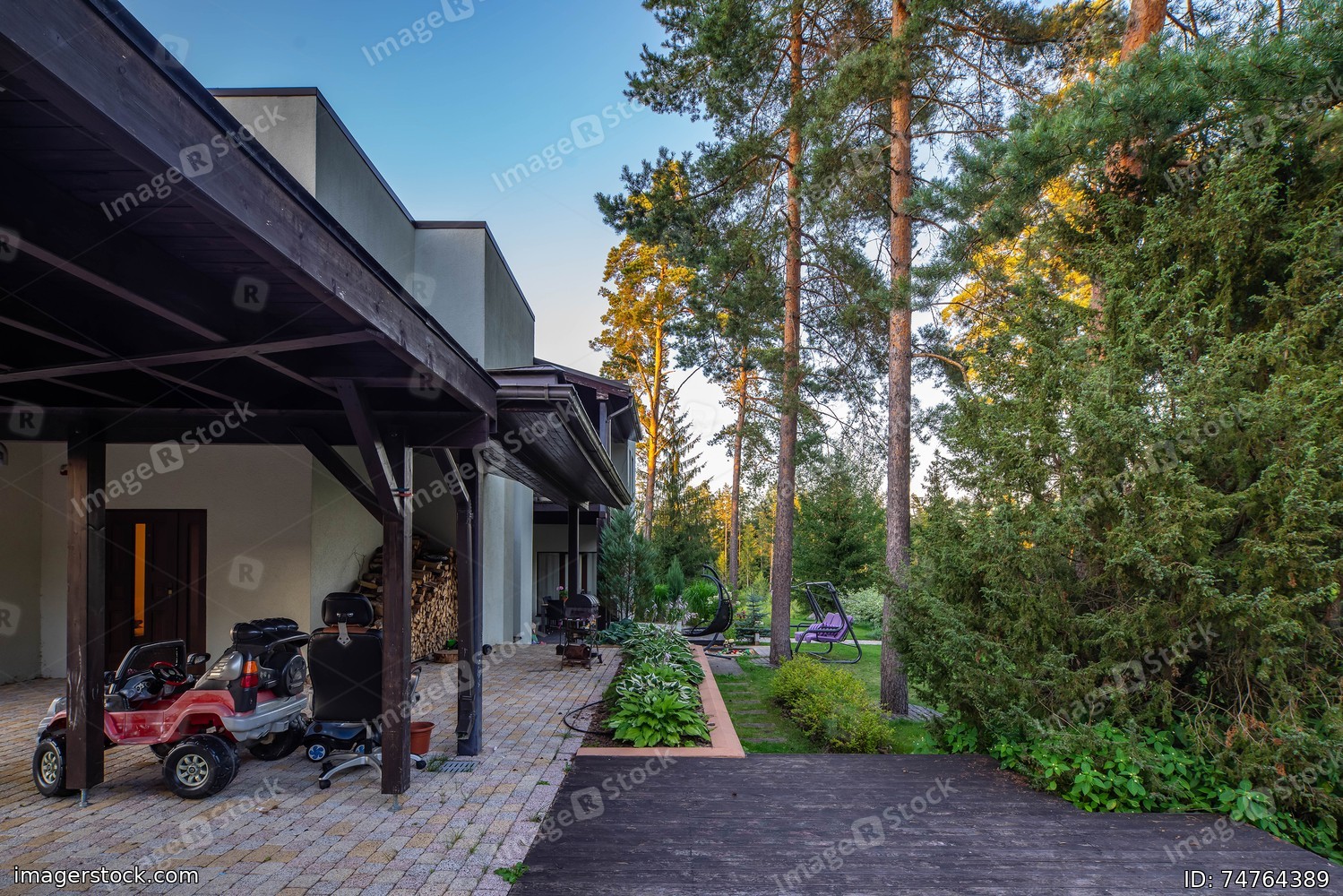 View of green garden of luxury private cottage near a pine forest. Exterior of modern private house. Swing in the garden.