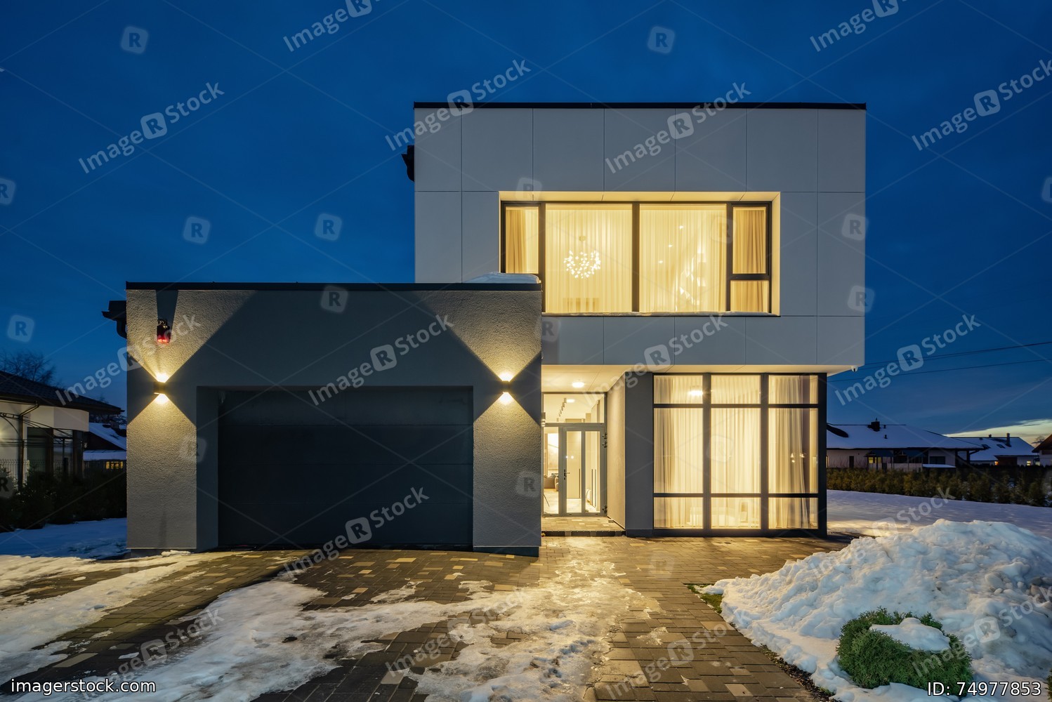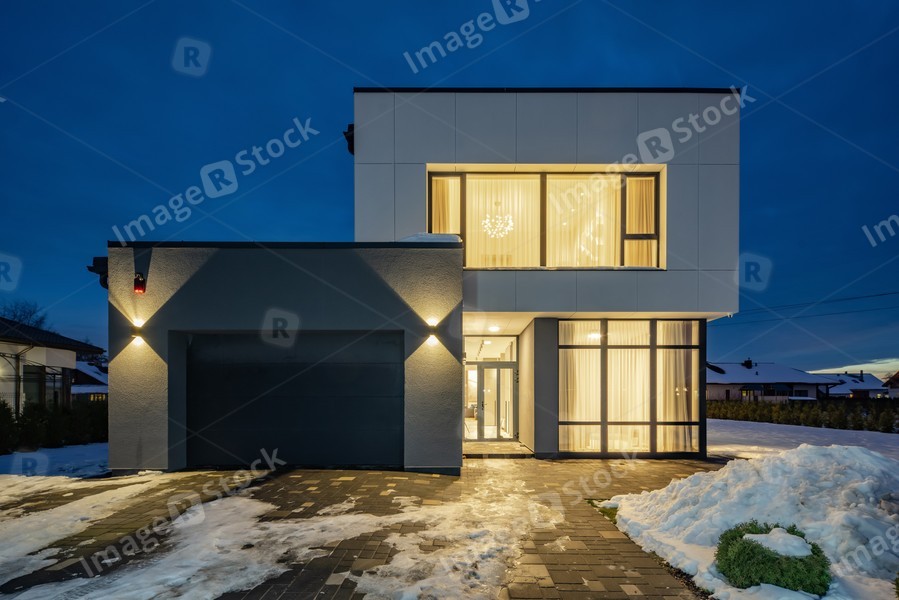 Exterior of luxury private house. Modern cottage at evening.