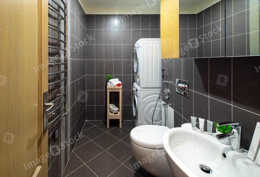 Sink, toilet, washing machine. Modern interior of bathroom.
