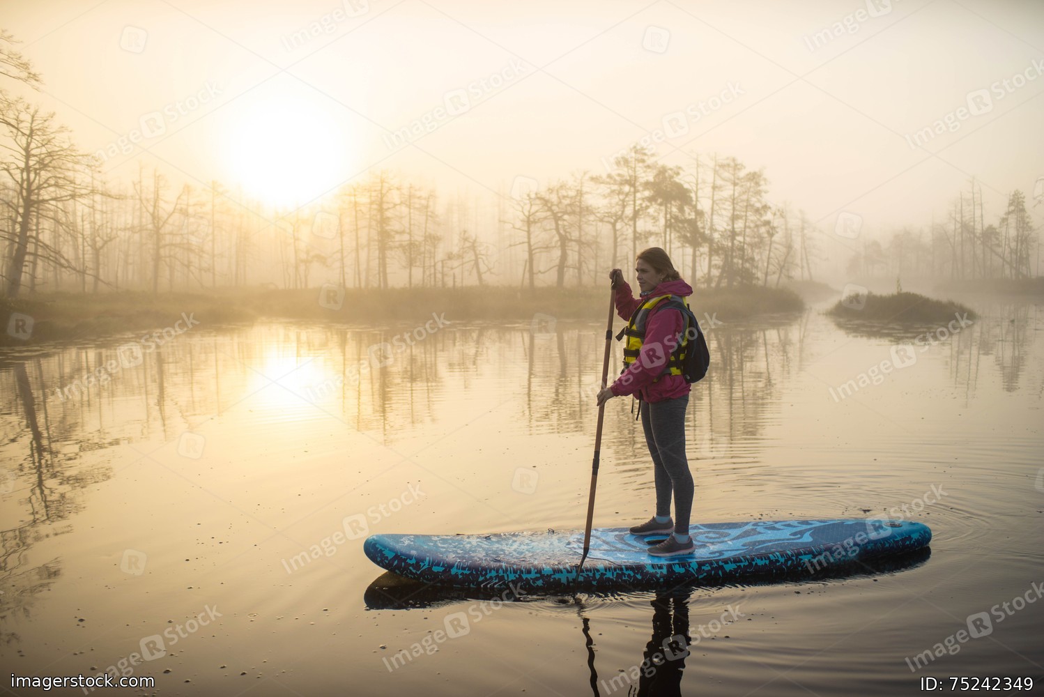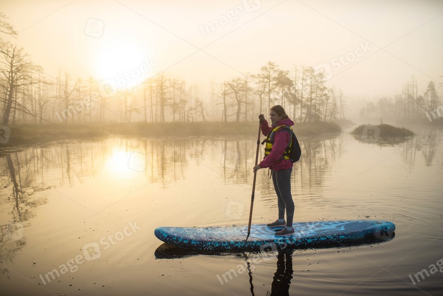 Woman slowly floating on the water on the sup-board. Fog and swamp.